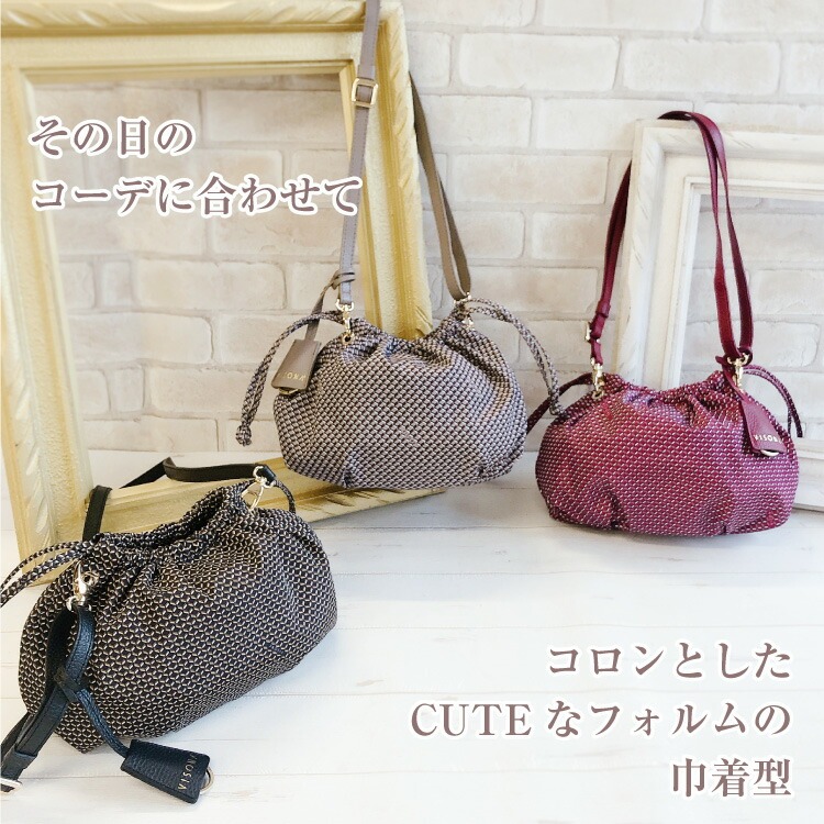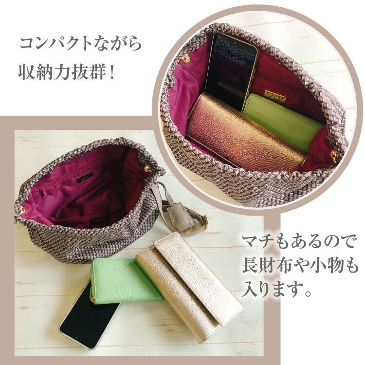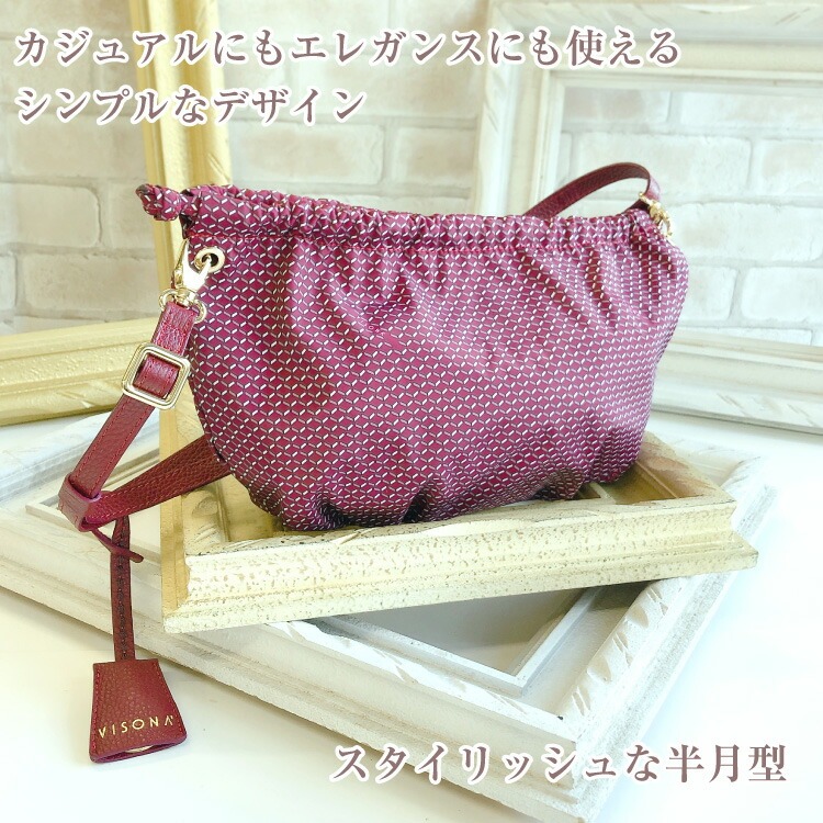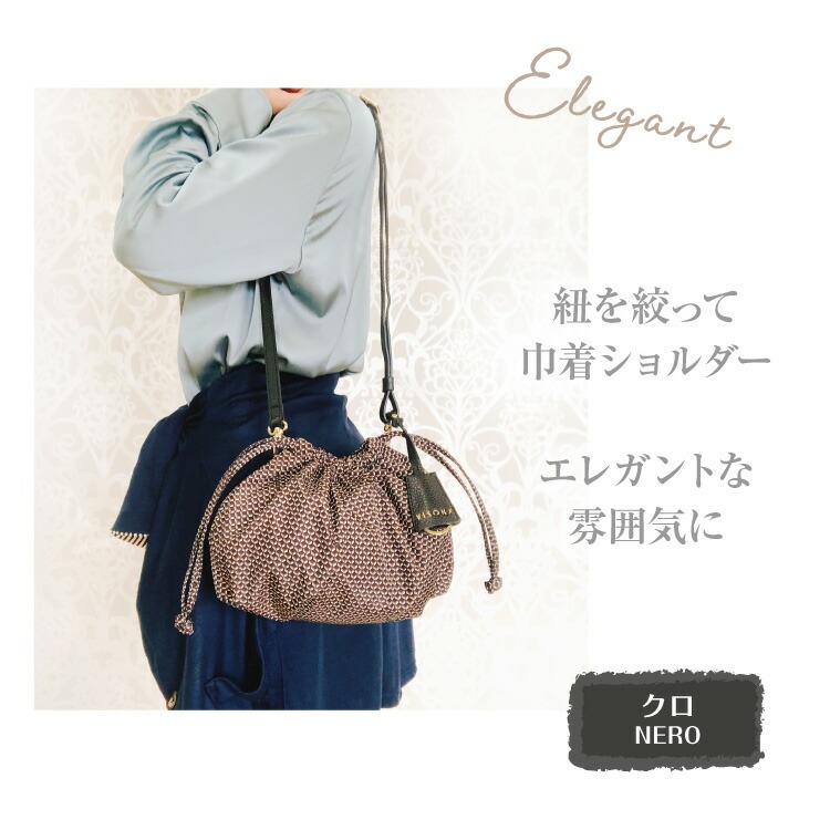 シンプルな半月型のシルエットから、巾着を絞ると巾着型バッグにフォルムが変わる個性的なショルダーバッグです。開口部は巾着絞りで大きく開き使いやすい造りです。内部はコンパクトながら広々としており、マチも十分あるので長財布やスマホなどお出掛けに必要な物が入るちょうどいいサイズ感。コンパクトな見た目より収納でき容量もたっぷりです。