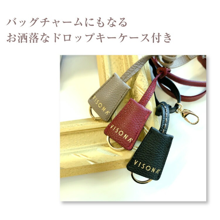 プリニオヴィソナのロゴが入った牛革製のドロップキーケースは内側にゴールドのリングが付いています。またお洒落なバッグチャームにもなります。