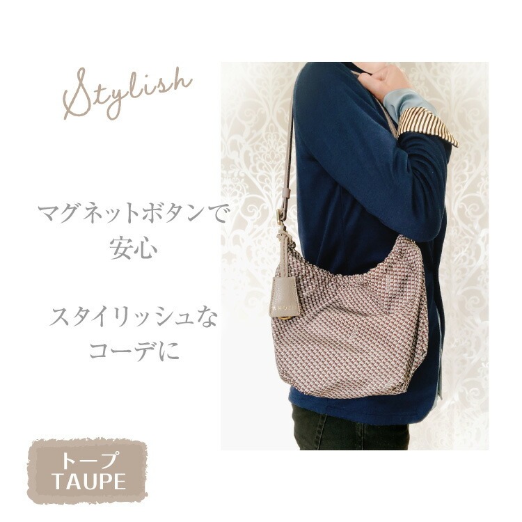 軽くて汚れにくく丈夫なナイロン生地を使用しており、この高級感ながら重さは200gと超軽量で驚きの軽さ。ショッピングや長時間のお出掛け、また折り畳んでご旅行などに持って行く時の収納にもかさばらずお勧めです。ナイロンなので雨や汚れにもサッと拭いて頂ければ安心です。