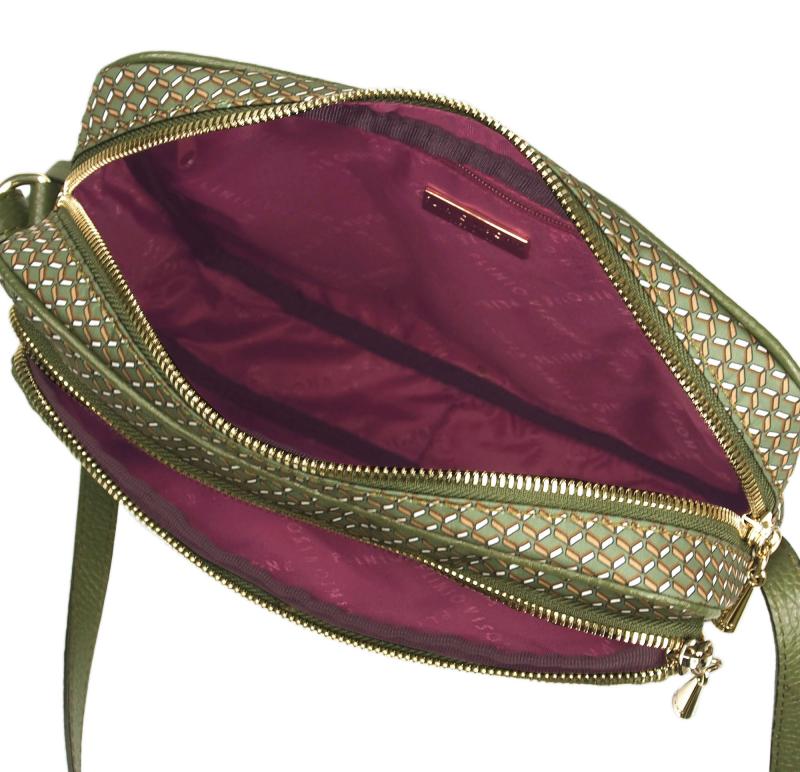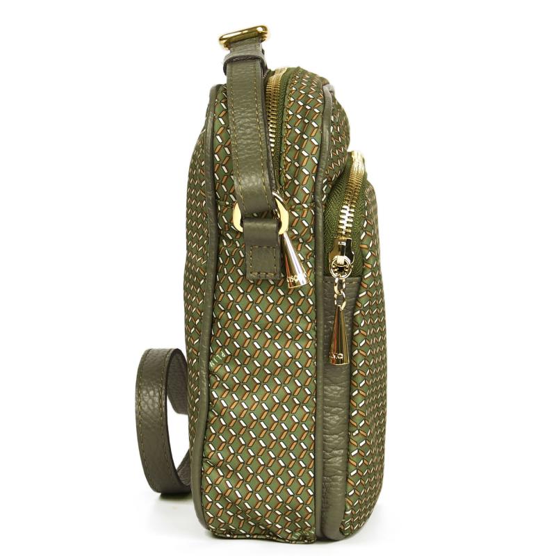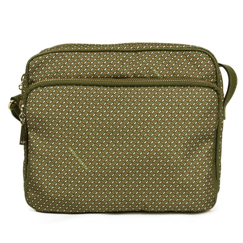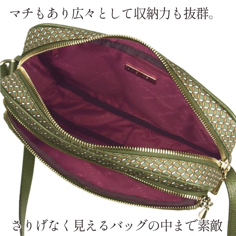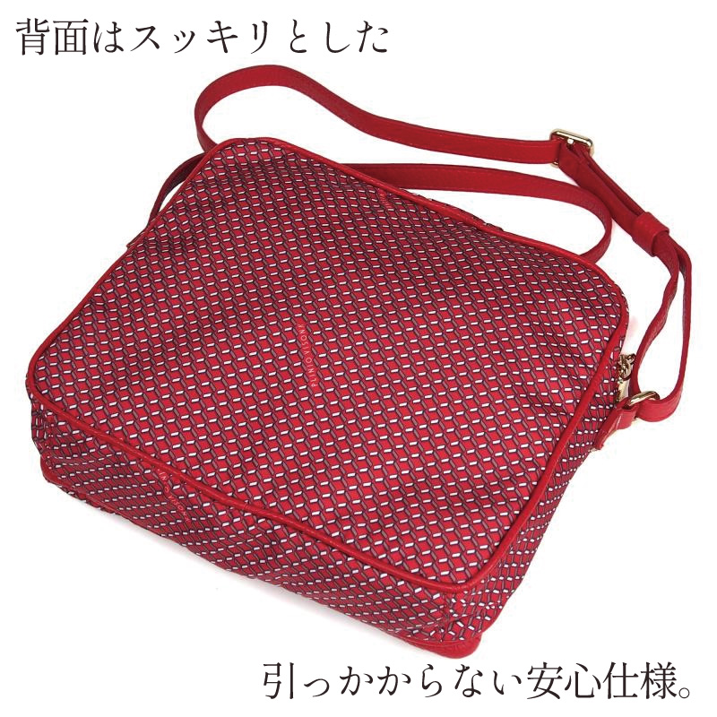 「ヴィソナ・ステッチ」と呼ばれる個性的な幾何学模様が全面にプリントされた軽いナイロン生地を使用した、エレガントさと実用性が両立した上品なショルダーバッグです。