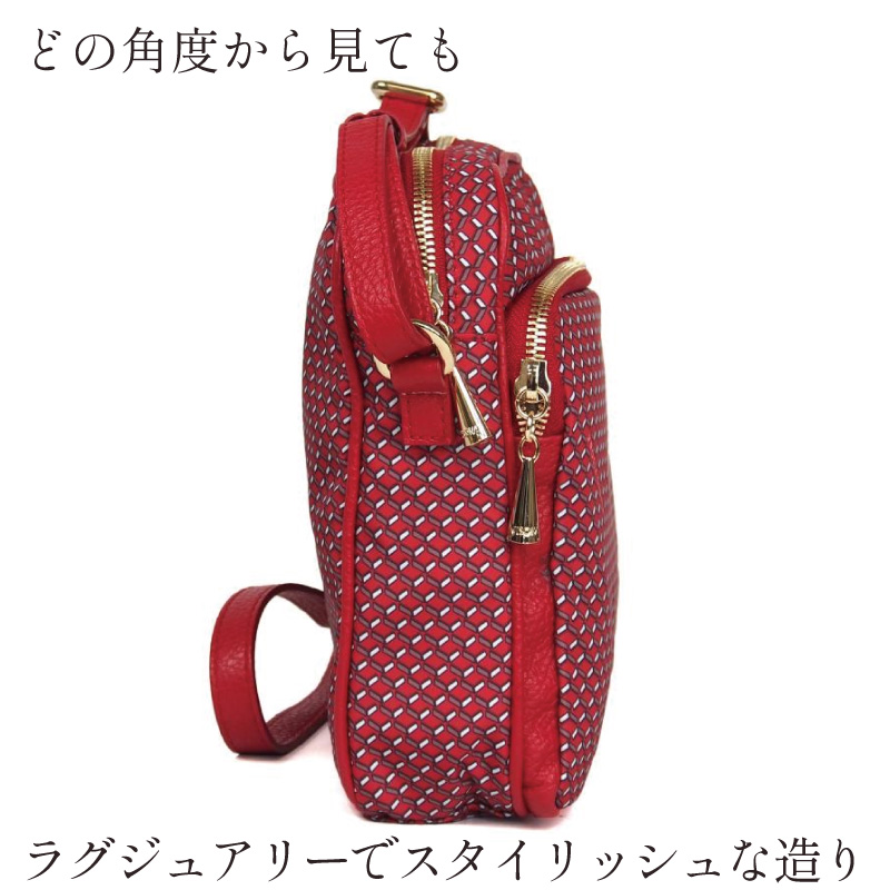 コンパクトな造りながらナイロン素材の柔らかさを活かし、見た目以上にマチが広がります。長財布やポーチ、小型の折り畳み傘や手帳などが入れられ収納力抜群です。丁度よい大きさでサイドから見てもすっきりしており、スタイリッシュなデザインです。ディテールにもこだわりがありファスナーの引手金具は、ブランドロゴ入りのお洒落かつ持ちやすい三角錐のデザインで洗練されたセンスを感じます。また部分的に配置されたポイントの牛革のシュリンクレザーも、アクセントとなり高級感を引き立てています。