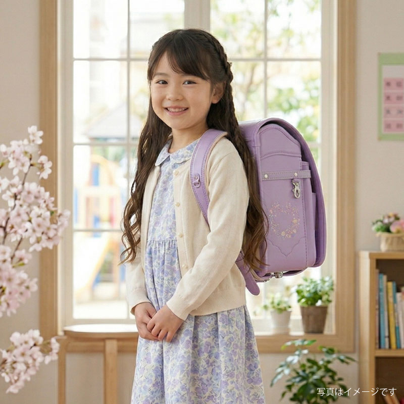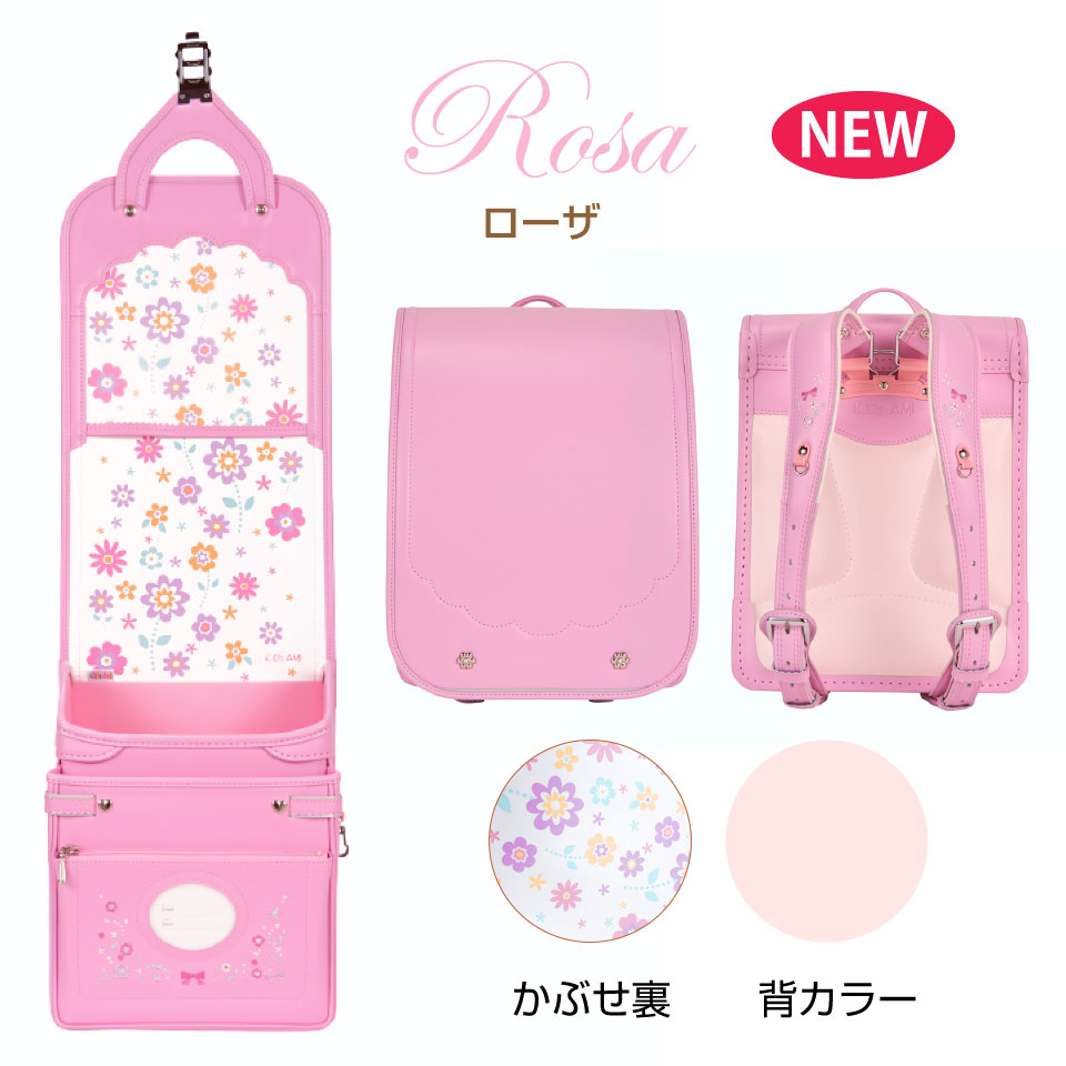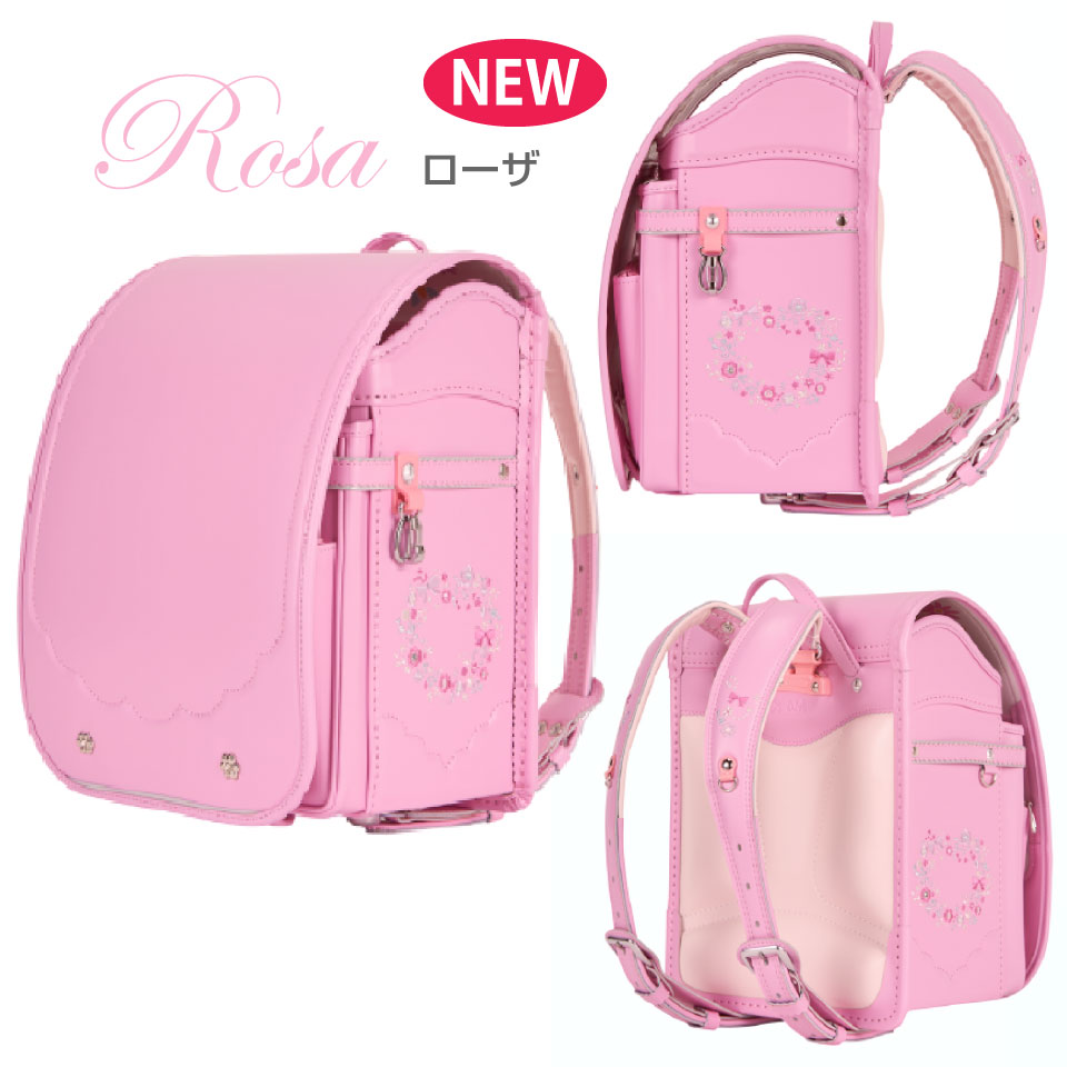 高級感のあるトラディショナルな学習院型でありながら可愛さあふれるデザインです。大きく入った花柄の刺繍とクリスタル鋲は女の子がときめく要素が詰まっています。ふたを開けても可愛らしい裏デザインも必見です。背カラーもパステルピンクがとってもガーリーです。可愛いハート型鋲と花柄刺繍のネーム窓