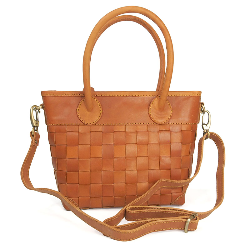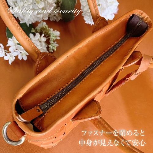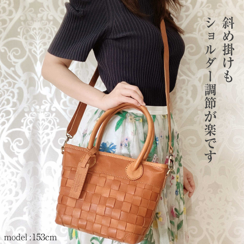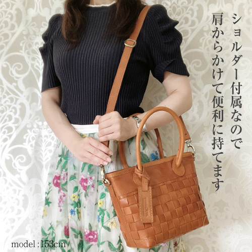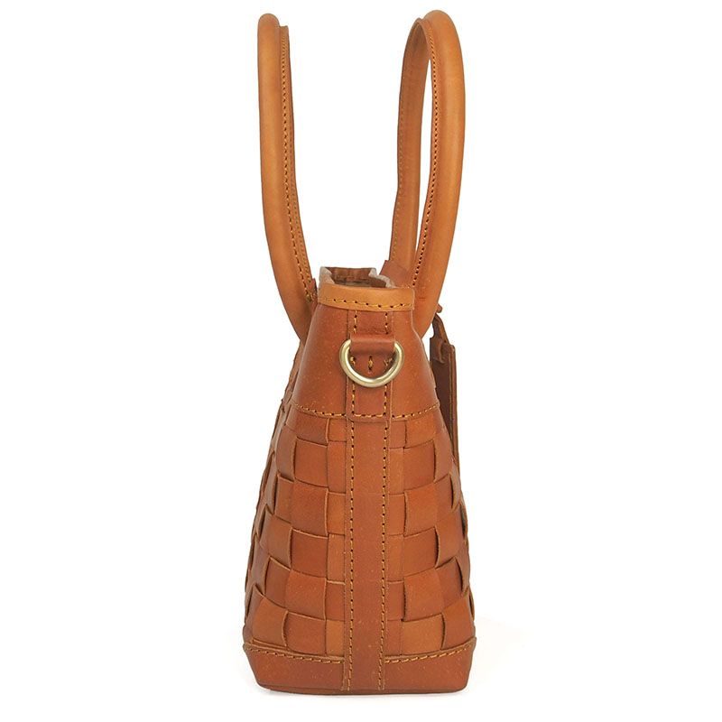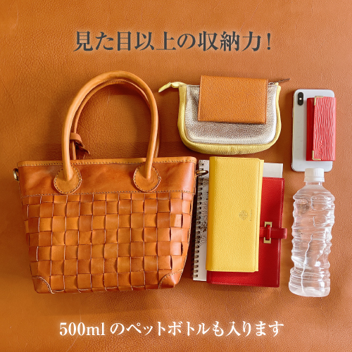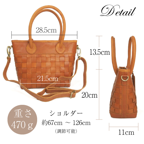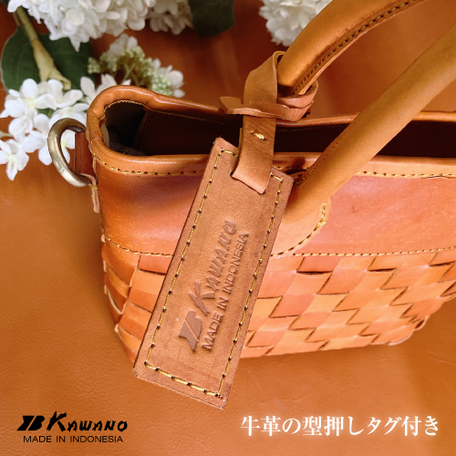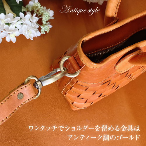 丁寧なメッシュの牛革から醸し出される雰囲気はヌメ革ならではの豊かな表情。ベルトを付けても外してもバッグとして別の表情をみせるお洒落な2WAYバッグです。ワンタッチで金具が付けられる、肩掛け、斜めがけもできるショルダーストラップ付きです。ハンドルは大き目で握りやすく丸みがあり、女性らしさも感じられます。また底面までヌメ革のメッシュで織られていて、どの角度からみても魅力的なバッグです。天然素材ならではの上質な経年変化を感じながら長くお使い頂けます。大切な方へのギフトにもおすすめです。