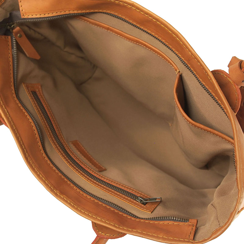 スマートフォンやパスケースなどを入れるのに丁度いいサイズの小さめポケットと、長財布や手帳も余裕で入るサイズの大きなフリーポケットが付いています。また、大事な鍵や小物をしまえるファスナー付きのポケットがあります。ファスナーは信頼のYKK製ファスナーを使用しています。さらに、ファスナー部分にもしっかりと周りを囲んで牛革のパイピングがされているので丈夫で安心です。カワノバッグのロゴを型押しした本革のプレートがついています。また、ハンドルには型押しのタグもついています。