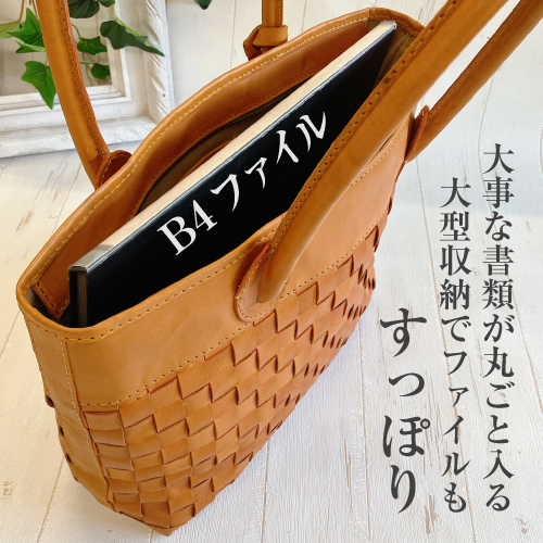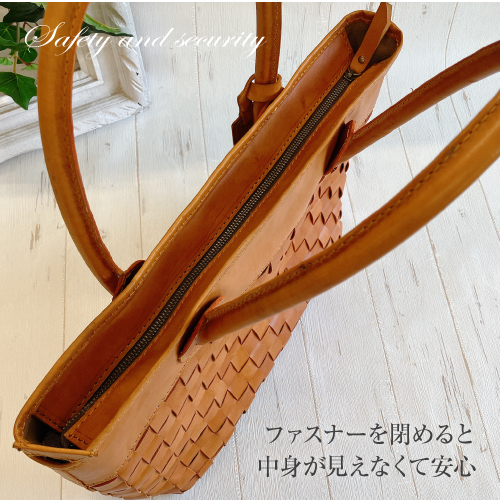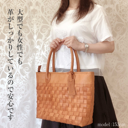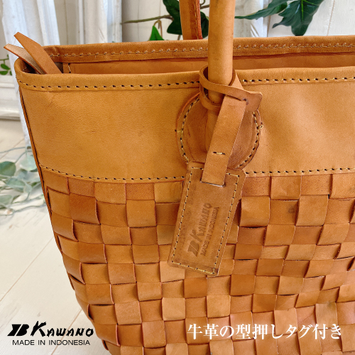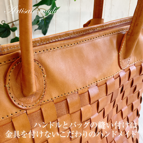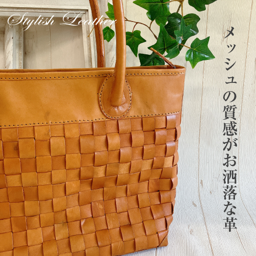 丁寧なメッシュの牛革から醸し出される雰囲気はヌメ革ならではの豊かな表情。遠くから見てもメッシュの美しさが目立つお洒落な大型トートバッグです。ハンドルは大きめで握りやすく丸みがあり、肩にかける事もできます。また底面までヌメ革のメッシュで織られていて、どの角度からみても魅力的なバッグです。天然素材ならではの上質な経年変化を感じながら長くお使い頂けます。大切な方へのギフトにもおすすめです。