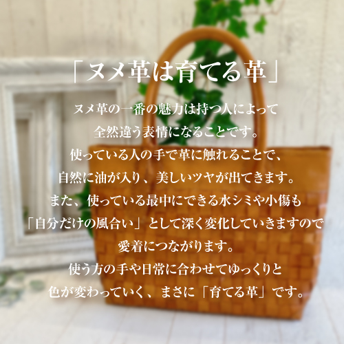 ヌメ革の一番の魅力は持つ人によって全然違う表情になることです。使っている人の手で革に触れることで、自然に油が入り、美しいツヤが出てきます。また、使っている最中にできる水シミや小傷も「自分だけの風合い」として深く変化していきますので愛着につながります。使う方の手や日常に合わせてゆっくりと色が変わっていく、まさに育てる革です。