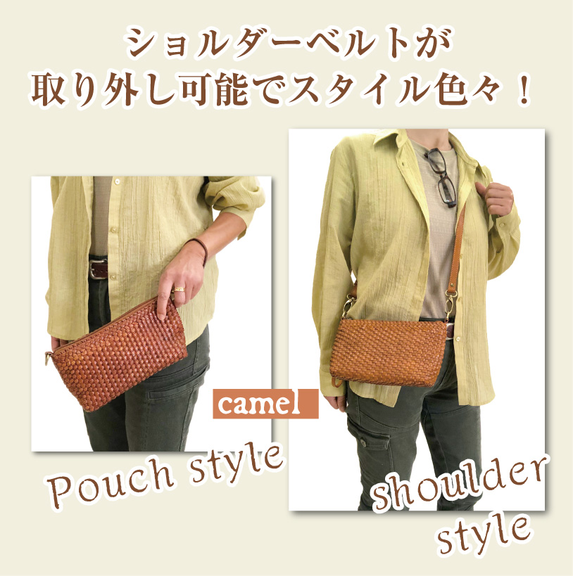 ファスナーのジッパー部分には長めのリストストラップ付きなので手首にかけて持ちやすい造りです。ショルダーベルトを外せばポーチやクラッチバッグとしてお使いいただけます。