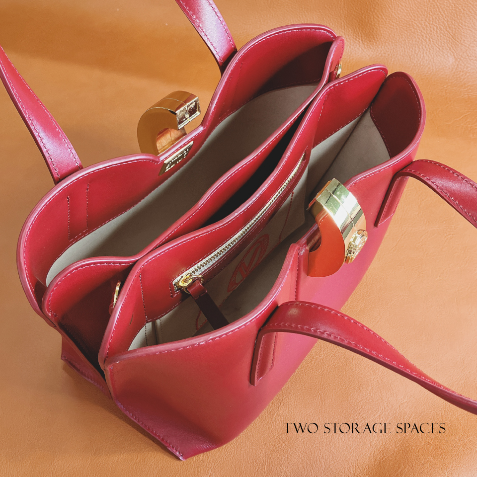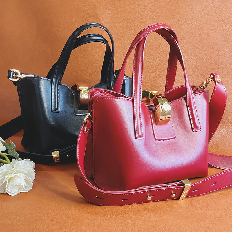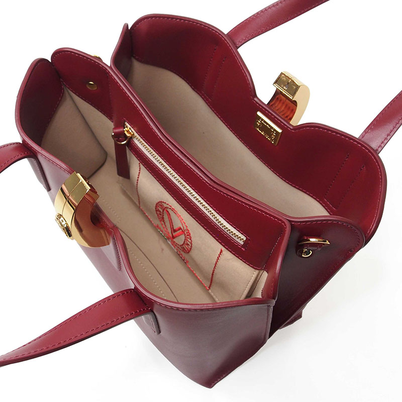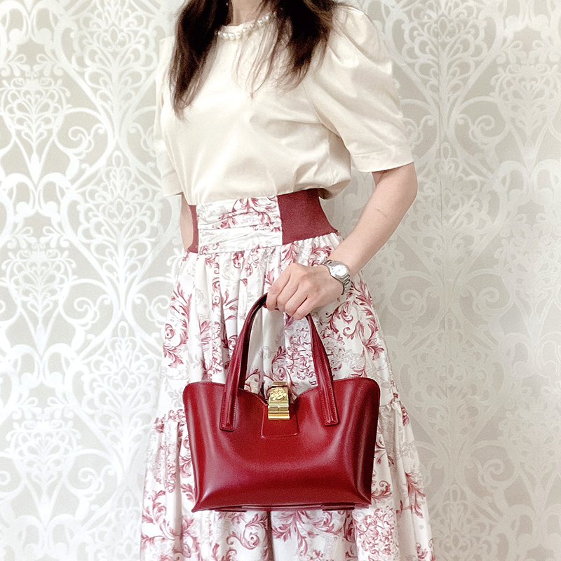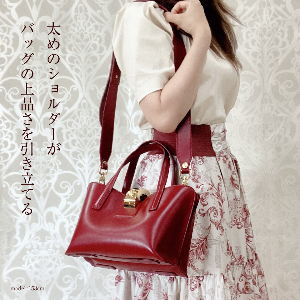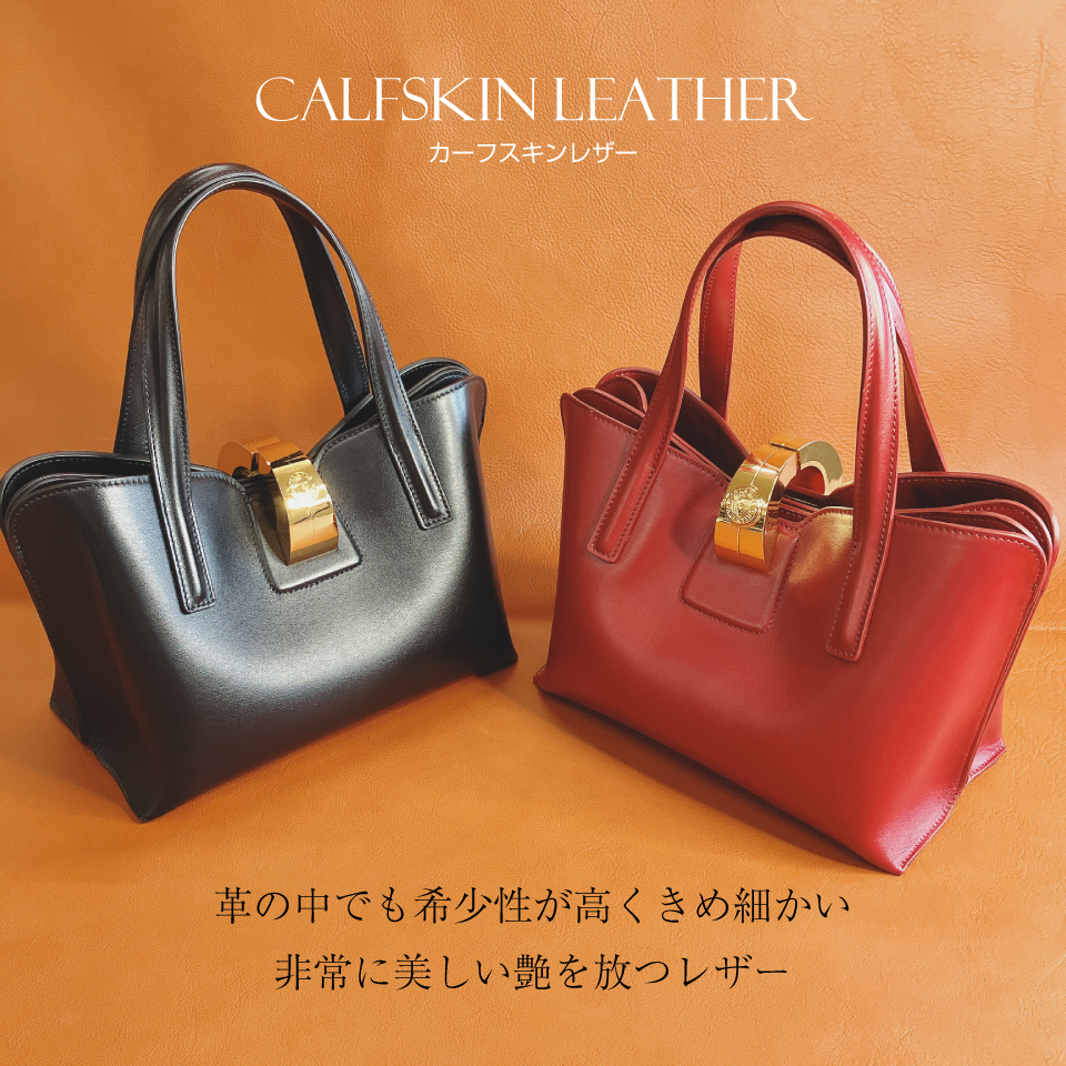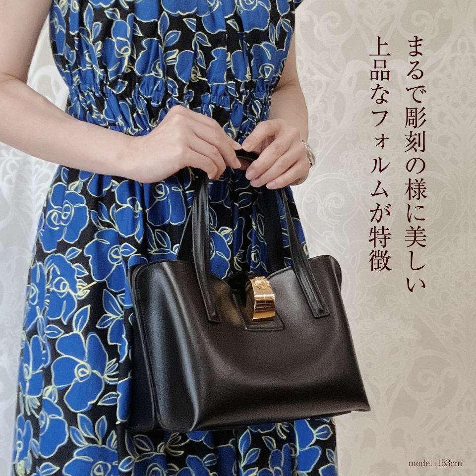 デザインはイタリアらしい高級な印象を与える気品あふれるフォルム。触った瞬間から滑らかさと光沢感が素晴らしいカーフスキンを、贅沢に使ったハンドバッグです。100%メイドインイタリアだからこそ感じられる他とは全く異なる“目を引く美しさ”。持っている女性をアップデートしてくれる存在感あるアイテムです。