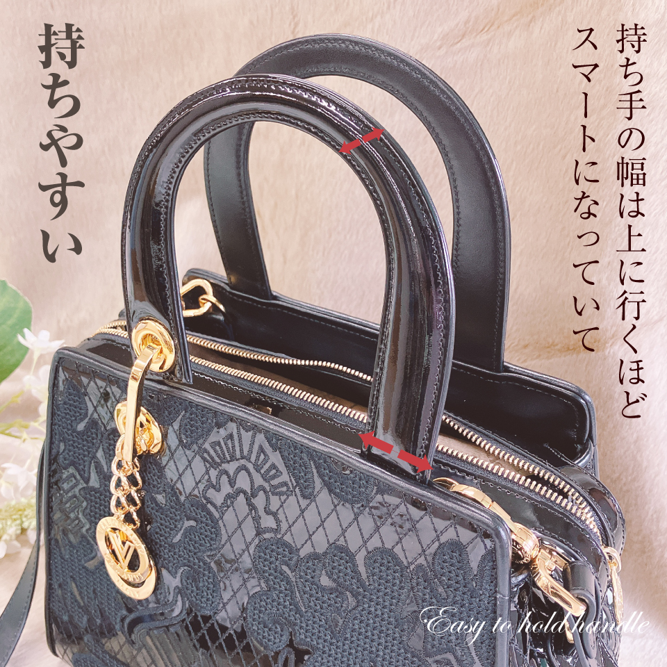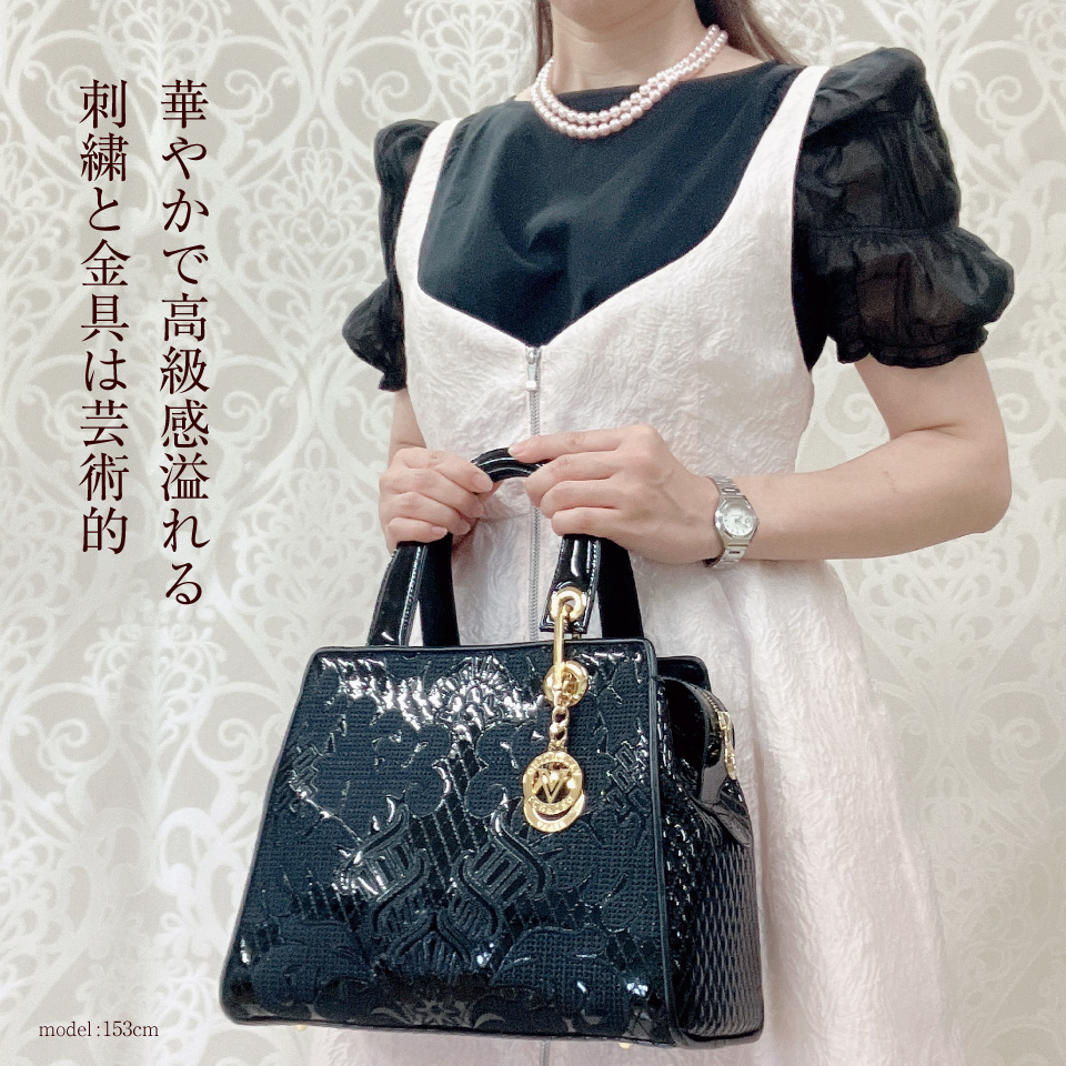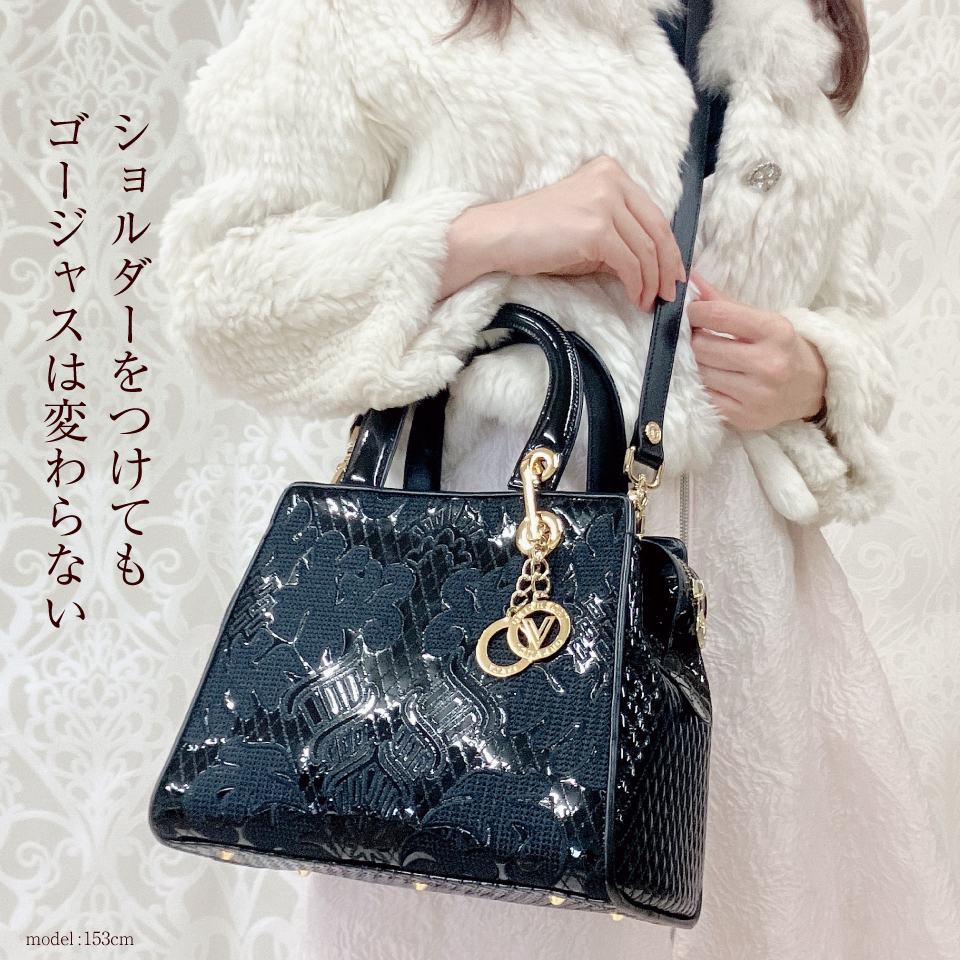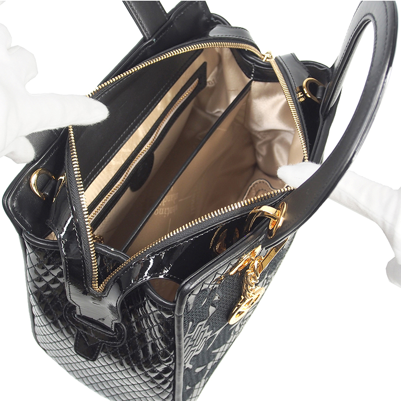 バッグの前面は幾何学的レースのようなテクスチャを感じさせる部分があり、パテントレザーの上に刺繍が施されています。背面・側面・そして底面までも上質なパテントレザーのダイヤ柄刺繍で造られ豪華です。常にエレガントなスタイルを好む方にお勧めのバッグです。また、真鍮製のロゴペンダントチャームは、クラシックで繊細でありながらブランドイメージをさりげなく際立たせています。付属の取り外し可能なショルダーで、手持ちでも肩掛けでも持ち運べます。内部は中央の仕切り1つ、コンパートメント2つ、ジッパー付きポケットと携帯電話ホルダー付きです。