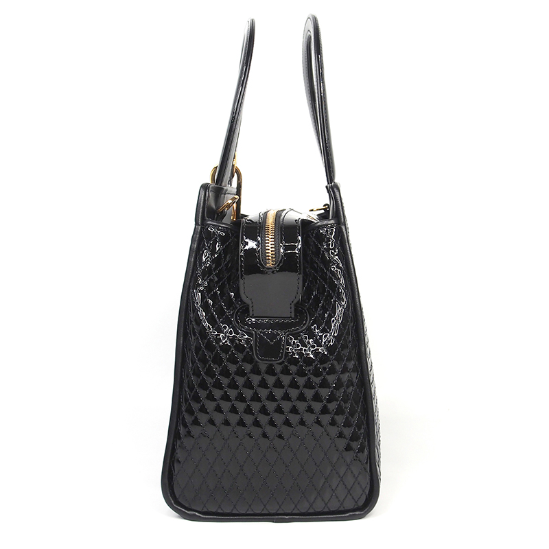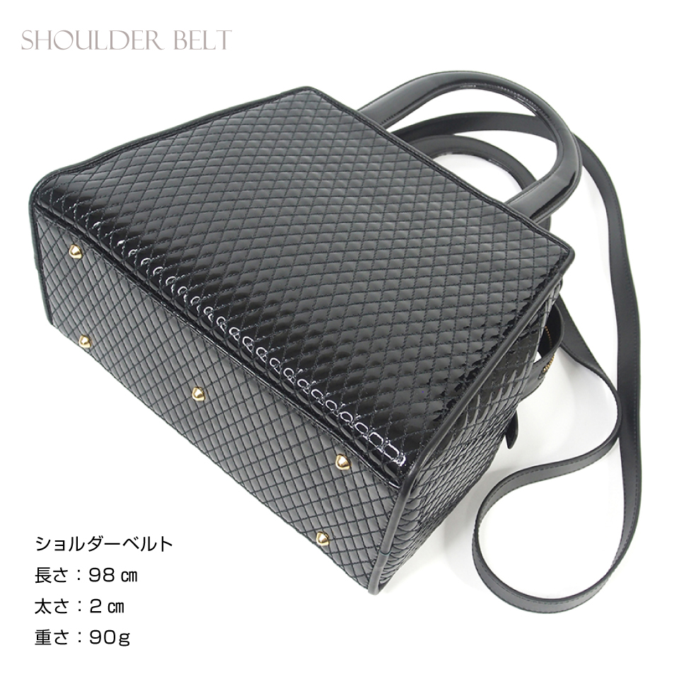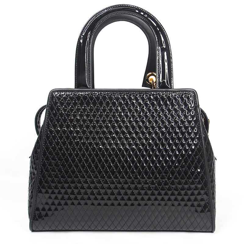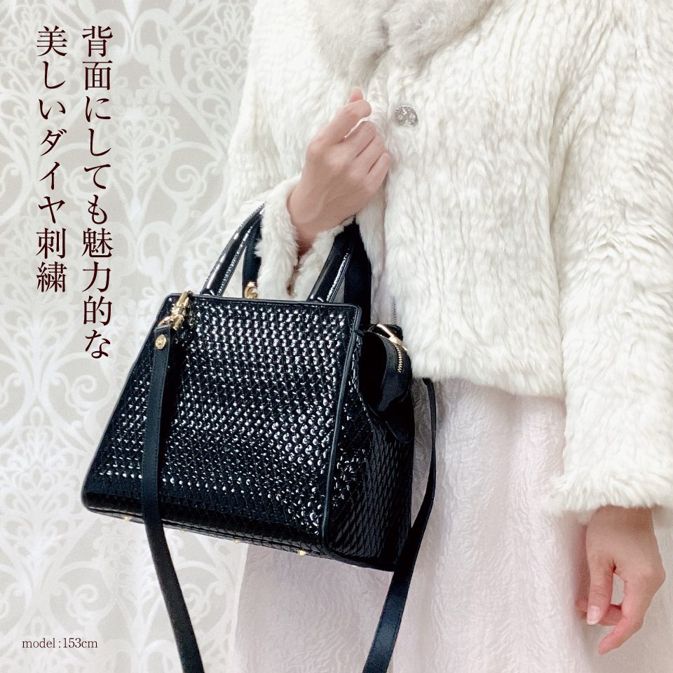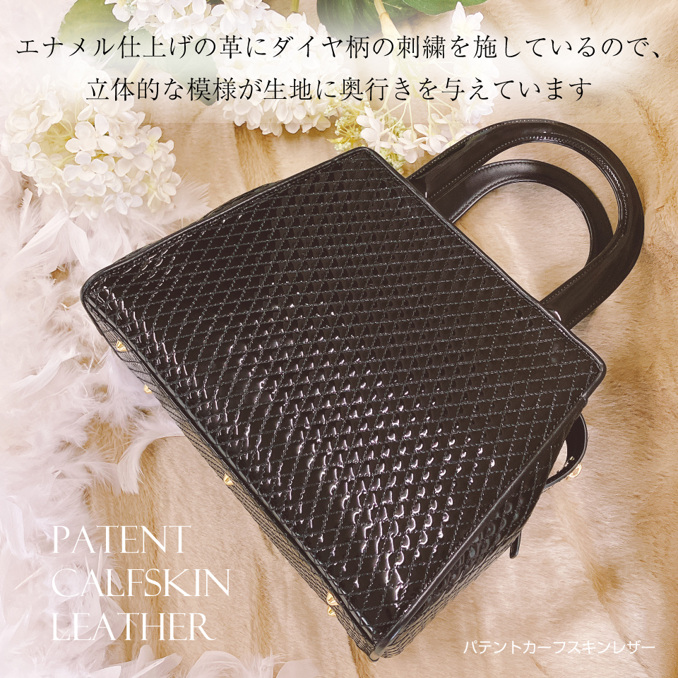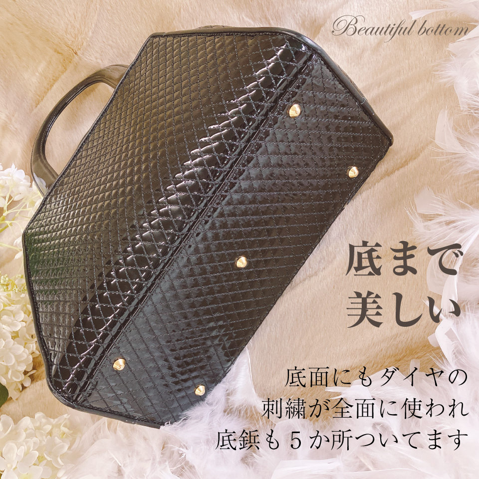背面・側面・そして底面までも、上質なパテントレザーのダイヤ柄刺繍で造られ豪華です。バッグをどの角度からみてもエレガントなお造りになっています。底面も汚れにくいように底鋲が5か所もついています。