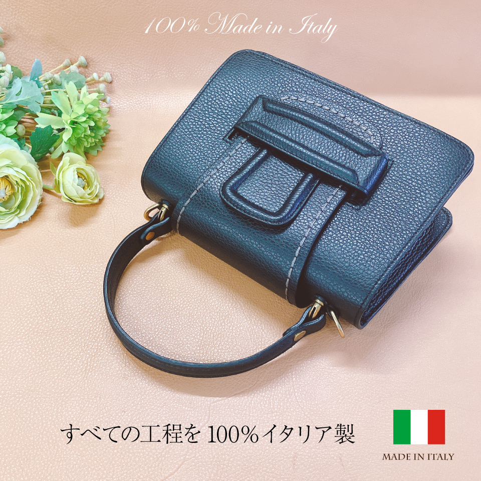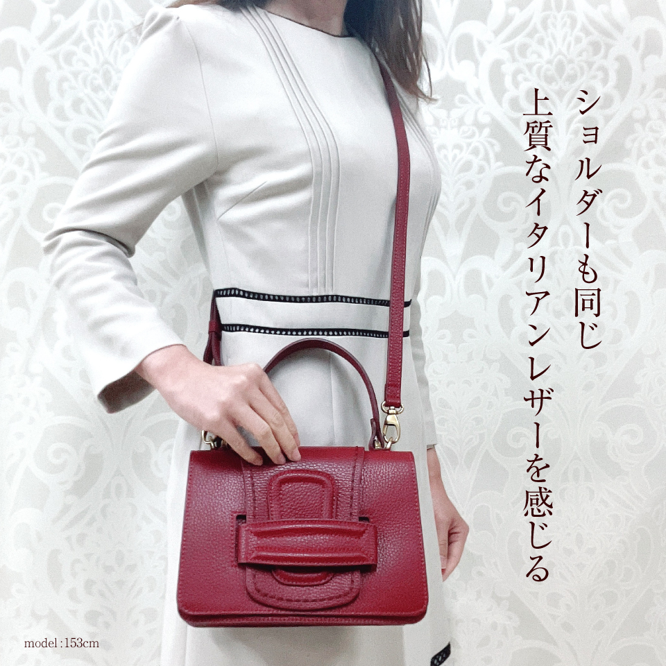ゴールドの控えめなパーツがお洒落なイタリアらしさを演出しています。ショルダーの素材も本体と同じフルグレインカーフスキンレザーでしっとりと上質なイタリアンレザーを感じて頂けます。