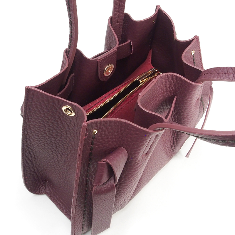 トップはマグネットで留めるタイプで、両サイドにあおりポケットがあり便利です。更にフリーポケットもついているので小物の整理がしやすいです。そしてセンター部分はジッパー開閉で防犯面も安心です。ジッパーを開くと開口が広くて見やすく、中身がすぐに確認できます。たっぷりとマチをとっていて、サイドの下の方のカッティングは女性らしい丸み帯びたカットでおしゃれです。携帯、お財布、キーホルダー、ハンカチ、ポーチ、パスケース、ミラー、手帳、折り畳み傘、グラスケース、ペンケースなどたくさんのものを収納できます。