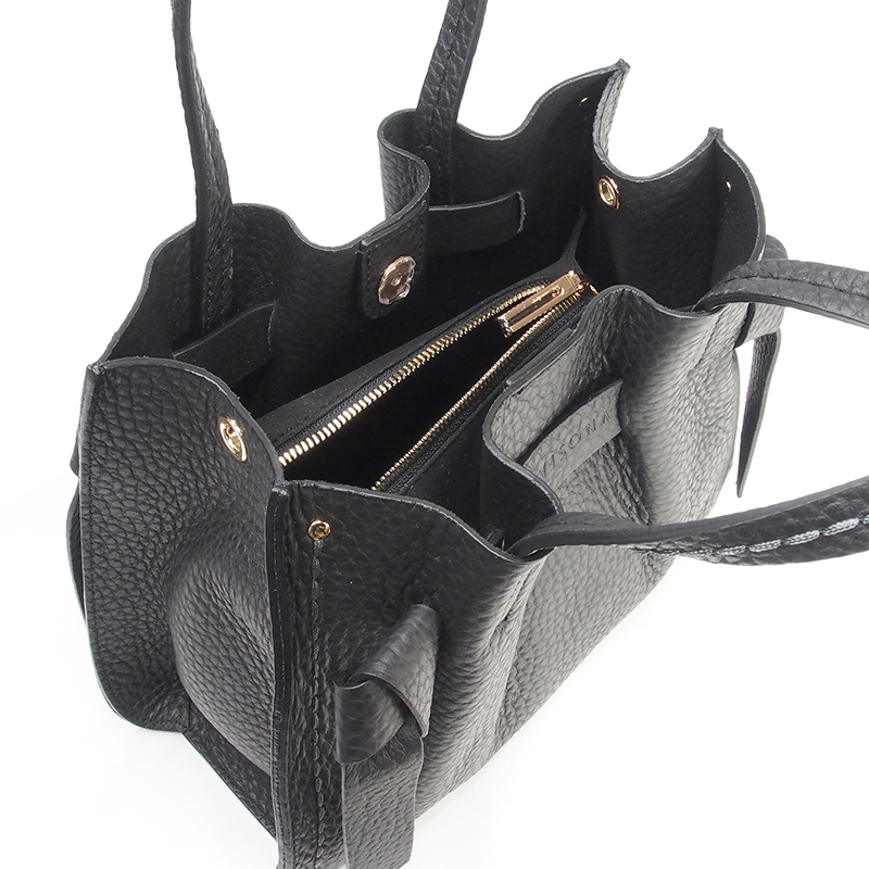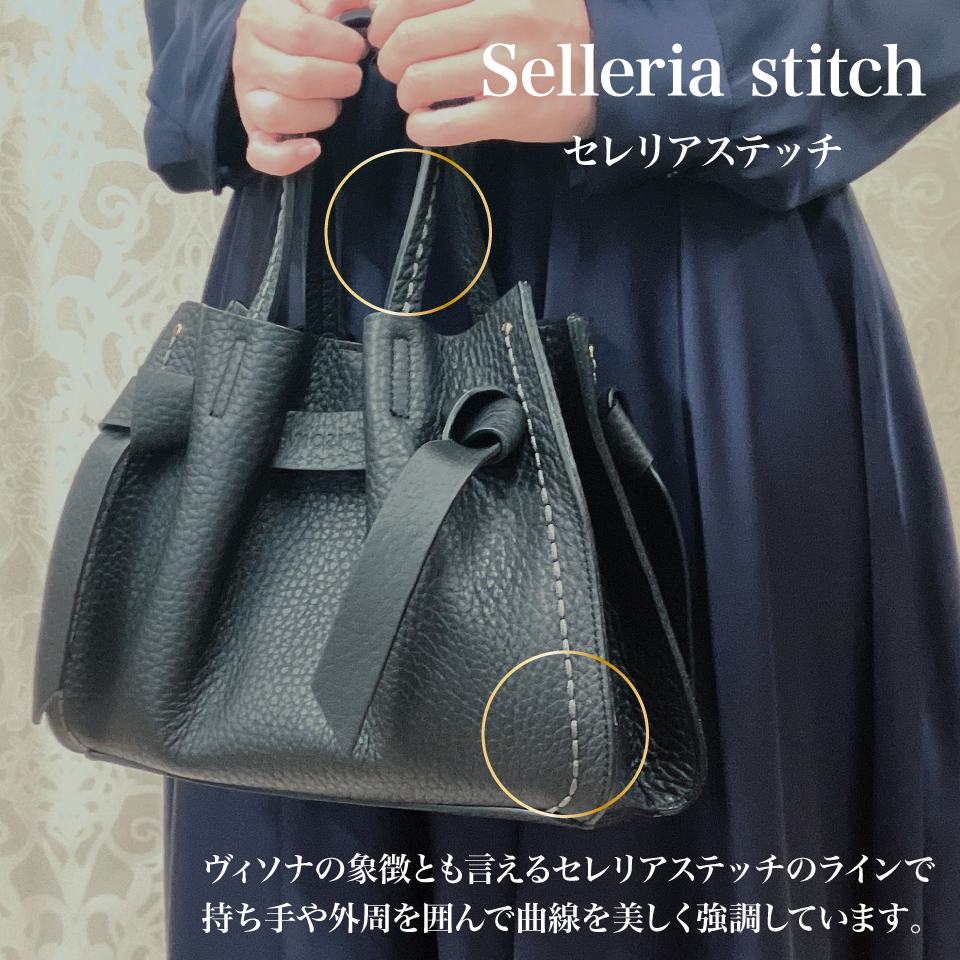 前面背面のレザーリボンの中央には、型押しのプリニオ ヴィソナのロゴマークがあります。内側のフリーポケットのプレートにもヴィソナの刻印がされています。底面にも大きくVISONAの型押しがあり、ひそかに見えない部分にもイタリア職人のイタリアンレザーバッグへのこだわりが感じられます。また、付属のショルダーベルトの調節金具にもVISONAの刻印がされています。そして、ヴィソナの象徴とも言えるセレリアステッチのラインでサイドの縁とハンドル部分を美しく強調しているのがハンドクラフトの温かみを感じさせます。