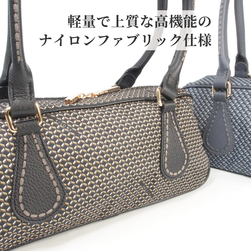 立体的な幾何学模様の高級ナイロン素材としっとりと手に馴染むカーフレザーを組み合わせた、100%イタリア製バッグです。エレガントな雰囲気でかつ軽くて丈夫な機能性、実用性を兼ね備えています。