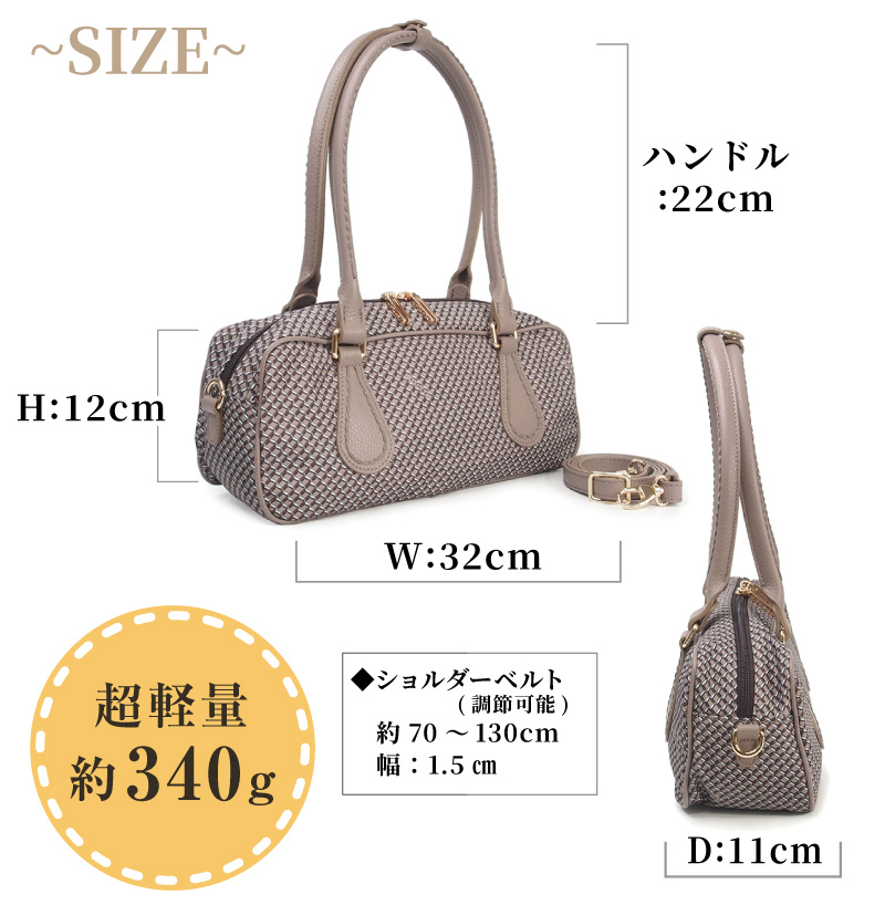 本革を使いながらもわずか340gの超軽量!普段使いはもちろん、ショッピングなど長時間のお出かけも軽快にサポートするバッグです。取外し可能のショルダーベルトをサッと付けて斜め掛けにもお使いいただけます。