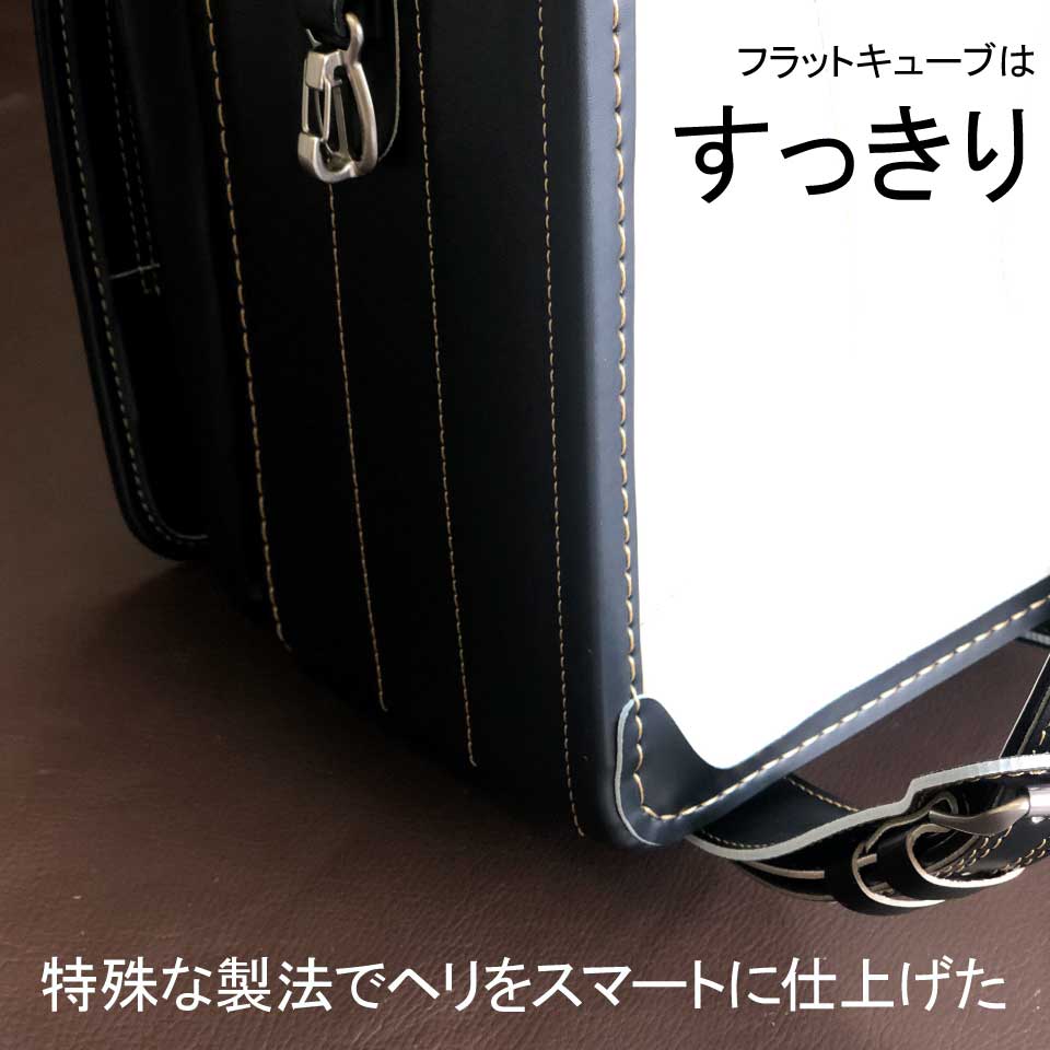 大きくてもシンプルなフラットキューブタイプだから、ロッカーへの出し入れも安心です。当店のランドセル工場は、フラットキューブタイプを作り始めた元祖。大マチの口部分の頑丈さは、長年の技術と経験に支えられて実現しています。