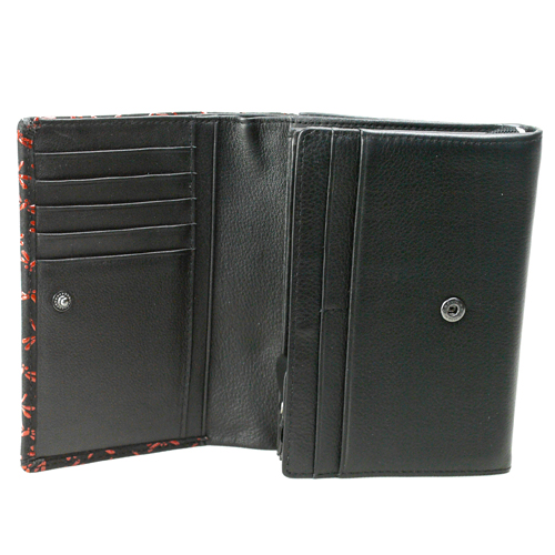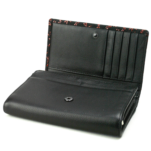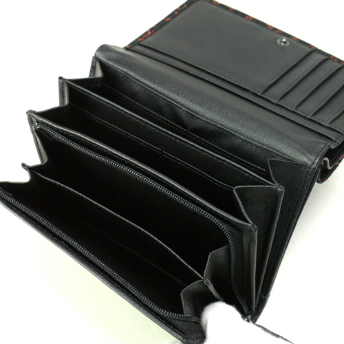 印伝 二つ折れ背段札入 内部開閉はスナップボタン式。