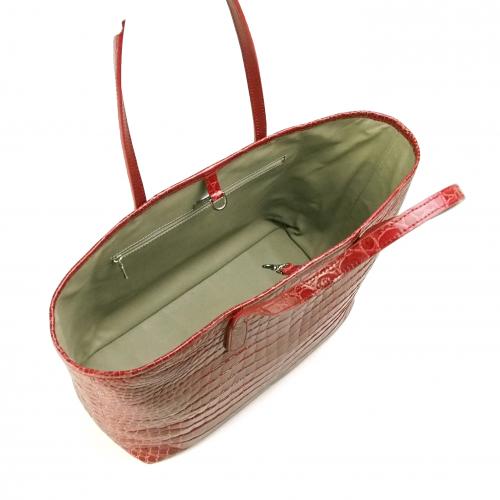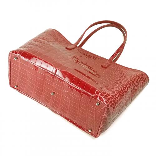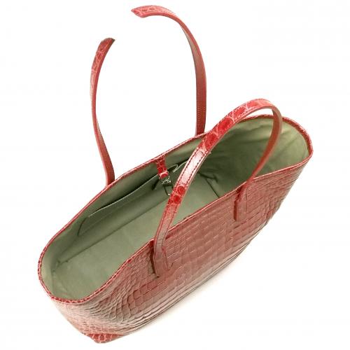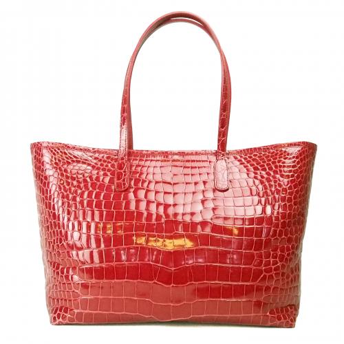 センター取り ワニ クロコダイル レディーストートバッグ シャイニング加工 コーラルレッド