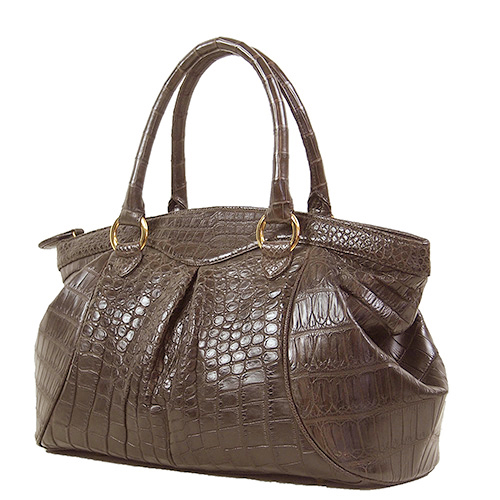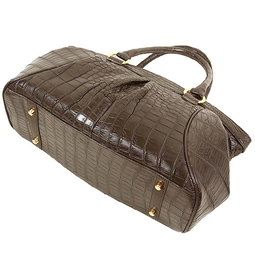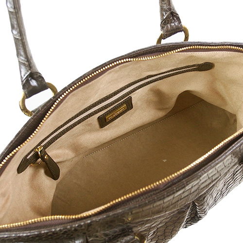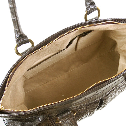 ハンドル部分から底面、パイピング部分に至るまで、厳選されたクロコダイルの革を使用しています。どこからみてもゴージャスで、持っているだけで注目されるバッグです。