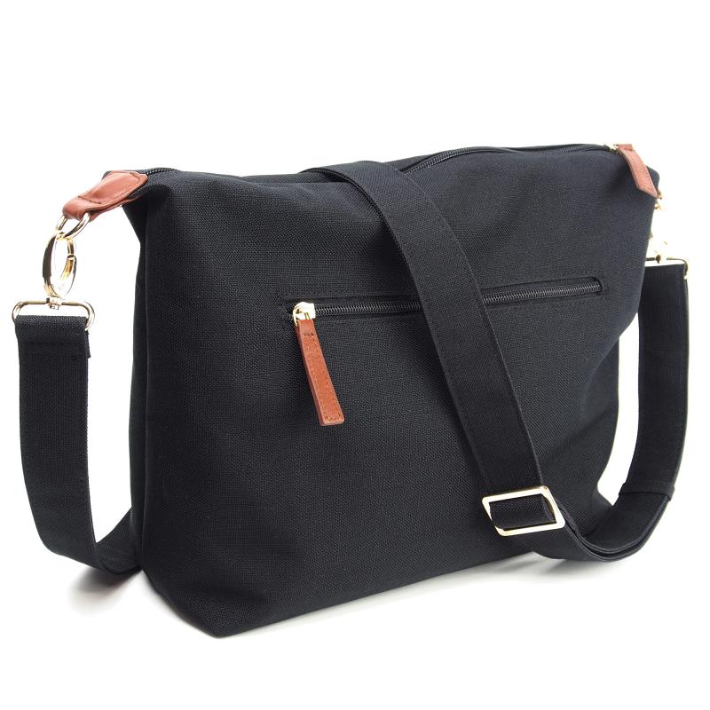 広々とした収納スペースマチも広く、たっぷりと物が入るマグネットボタン式の実用的なメイン収納部。その背面にはファスナーポケット、前面にはオープンポケットがあり、小物もすっきりと収納することができます。明るい生地なので、中の荷物も見やすく出し入れや整理整頓も楽々です。※写真の小物は商品には付属致しません。