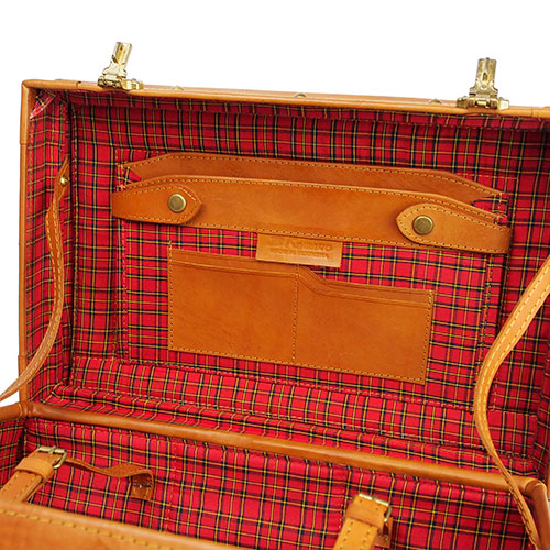 内装は温かみのあるチェック柄なので汚れも目立ちません。開いた時にフタ側を止める、両サイドの開き止めも革製です。