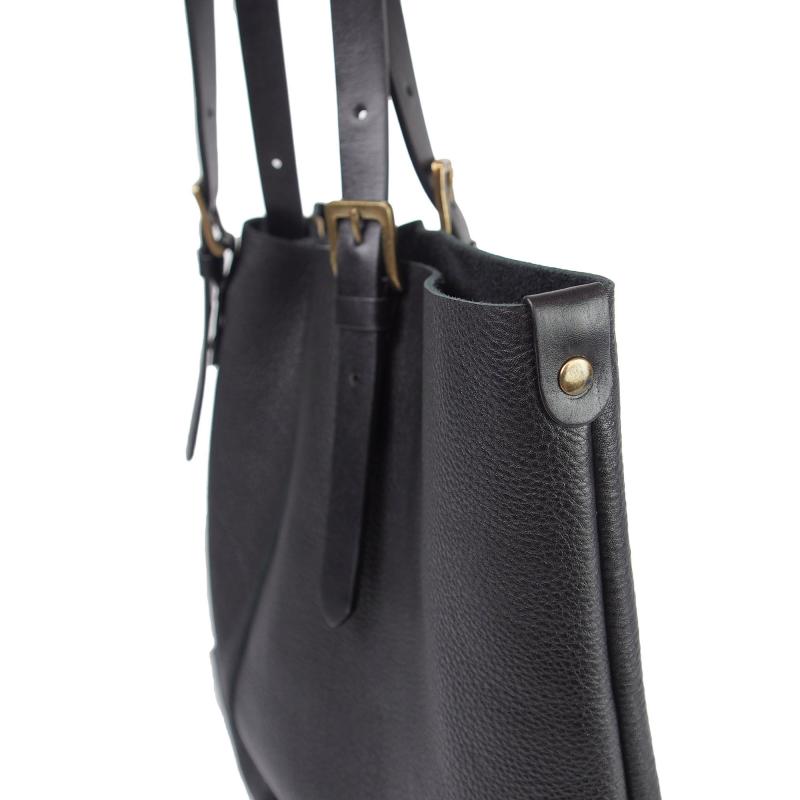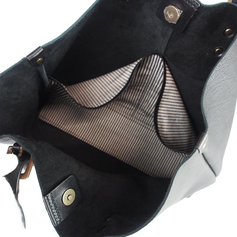 普段あまり荷物が少ない時には、柔らかい革なので両サイドのホックを閉じてすっきりコンパクトにお使いいただけます。