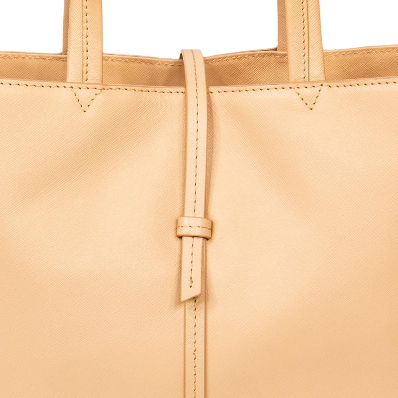 サフィアーノレザーは独特の細かい筋模様の型押しを施しており、やや硬めのしっかりとした質感です。型崩れしにくく、かつ品のある光沢を放ち高級感があります。サラッとした触り心地で肌馴染みが良く、キズや汚れがつきにくく耐久性があります。また雨や水にも強く防水性、撥水性が高いので柔らかい布でサッと拭くだけでお手入れも簡単です。見た目よりも軽いのが特徴で、お荷物が多くても疲れにくく普段使いからお仕事まで様々なシーンでお使いいただけます。