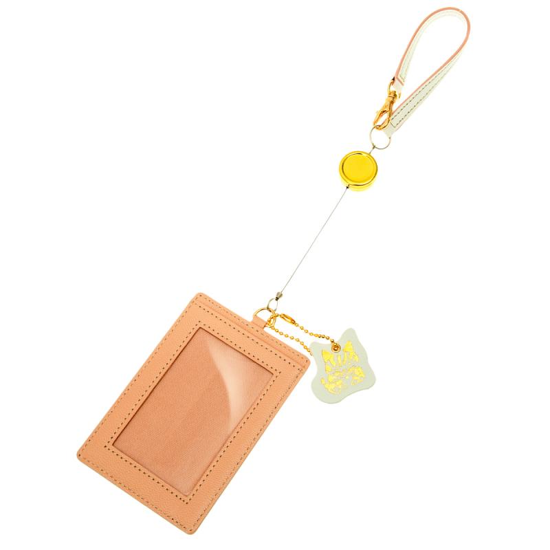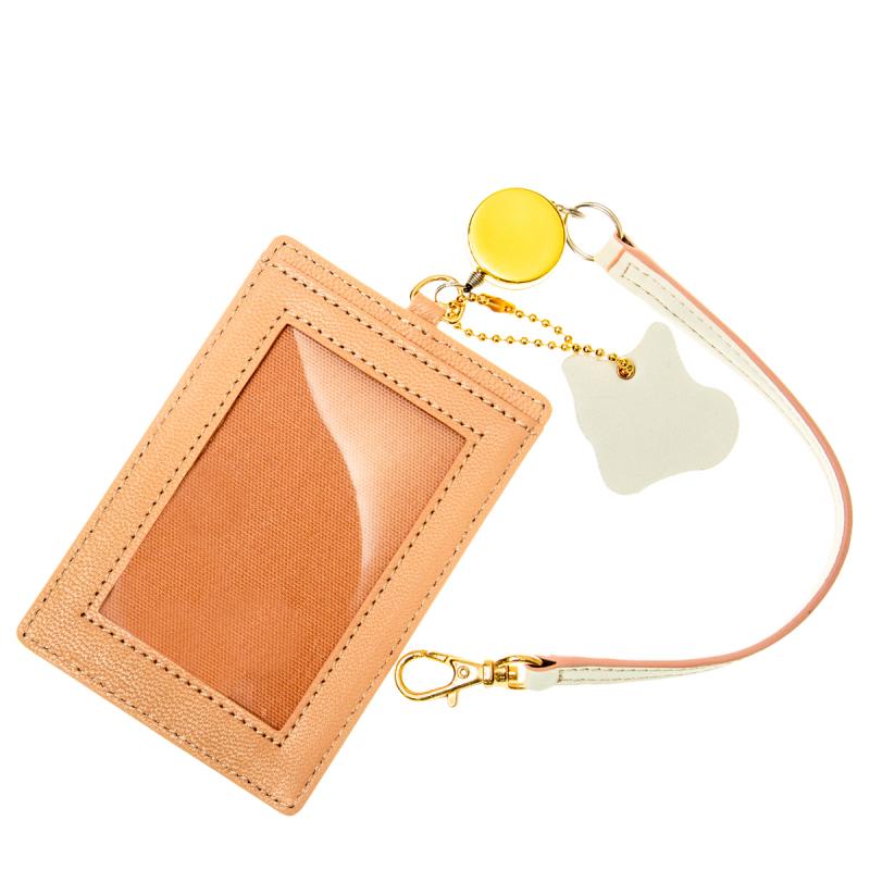 【メール便送料無料】★必ずもらえる牛革チャーム★パスケース 定期入れ 牛革 本革 リール付き 猫チャーム付き ストラップ付き 渡辺あきお 猫イラスト WA-001 ベージュ