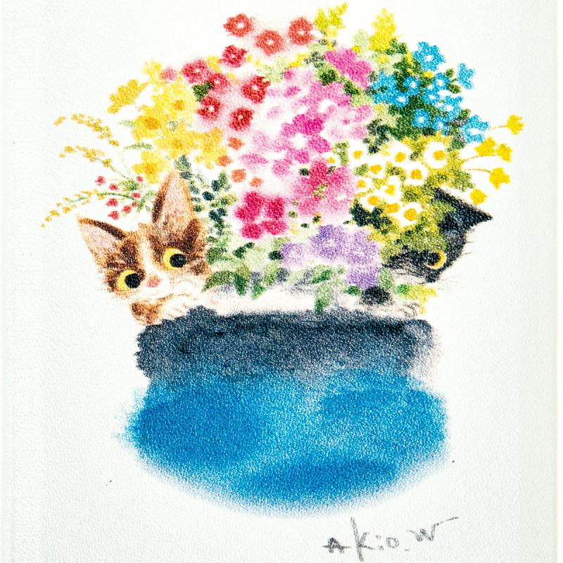 お花の横から顔をのぞかせる子猫に癒されてください。渡辺あきお先生作のイラスト箔押しをした牛革製のチャームが付きます。