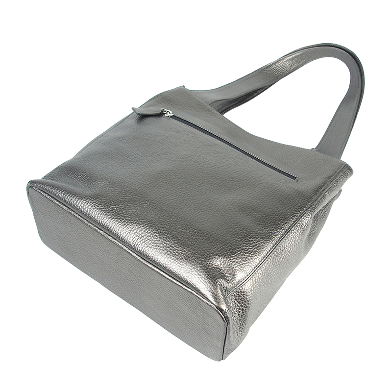 背面はファスナーポケットが1つ背面はファスナーポケットが1つ付いています。すぐ取り出したい小物の収納に役立ちます。ファスナーは牛革の引手がついていて、開け閉めしやすく細かいところまでこだわりが感じられます。底面まで外側全面に牛革を使用しているので、耐久性があり丈夫、長くご愛用頂けるバッグです。