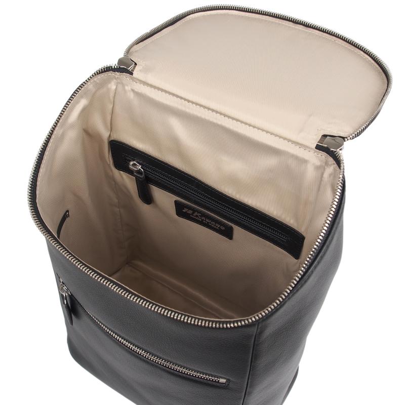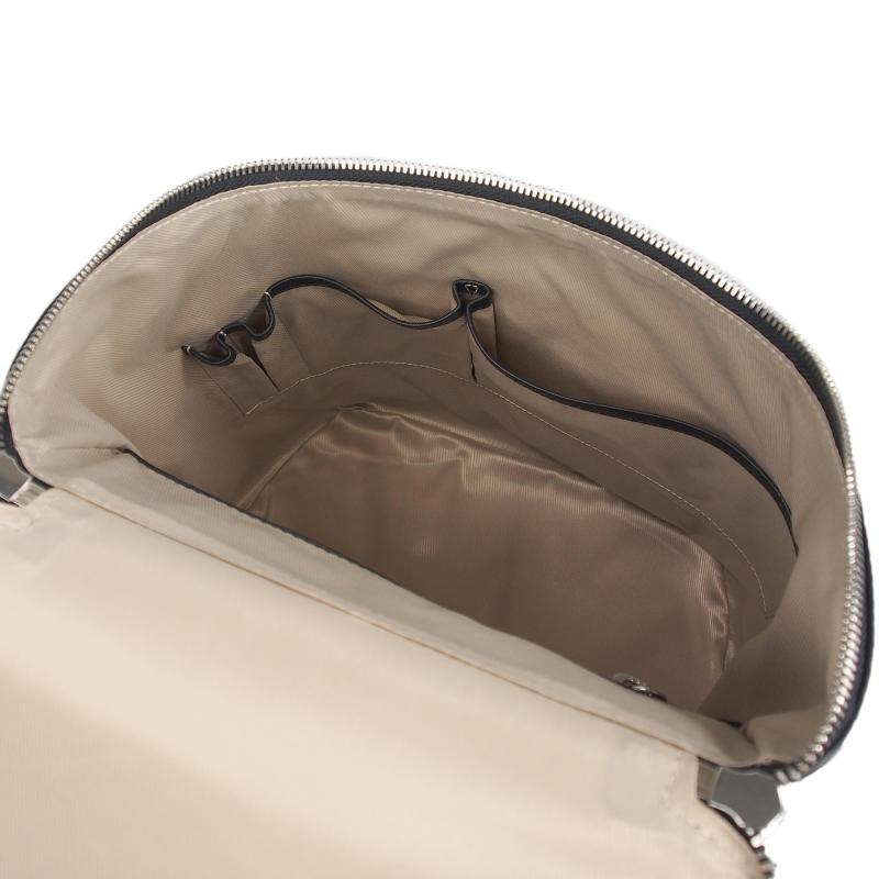 上部の大きく開くラウンド型のファスナーを開けると、収納部は広々としており明るい生地なので奥まで見やすい造りです。ファスナー式ポケットやフリーポケットがあり充実の収納機能。また小型の水筒や傘なども入れられ、見た目よりもずっと物が入るので使いやすさ抜群です。