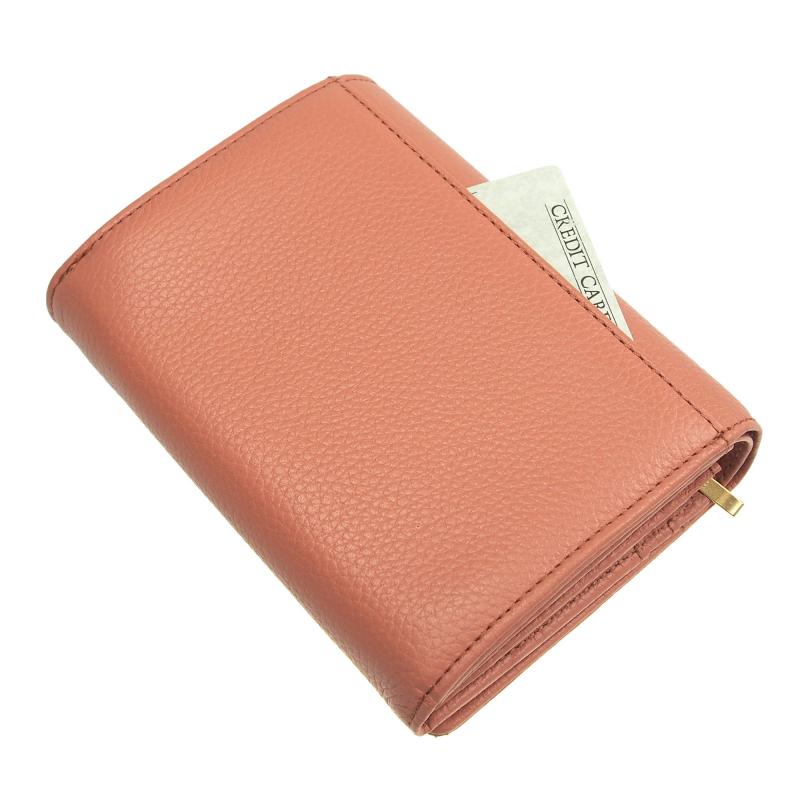 スナップボタンを開けるとカードの収納部分です。縦にも入れられるのでよく使うカードは見やすく取り出しやすくなっています。折り財布ながらカードは約18枚も収納可能でフリーポケットは6ヶ所で合わせて24ヶ所のポケット収納があります。カードをたくさんもっている主婦やOLさんにもぴったりの豊富な収納機能です。 お財布にボリュームが出たときもスナップボタンで留めて頂くことで安心して収納出来ます。