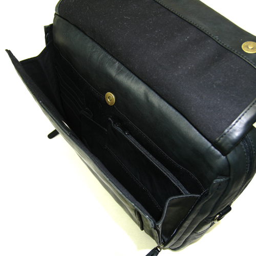 前面にはボタン式のフリーポケットが付いています。両サイドのファスナーを利用することで、大きく開口することができます。内側背面にはカードケースやファスナー式の小物入れが付いています。携帯電話や財布、キャッシュカードなどの収納ができます。