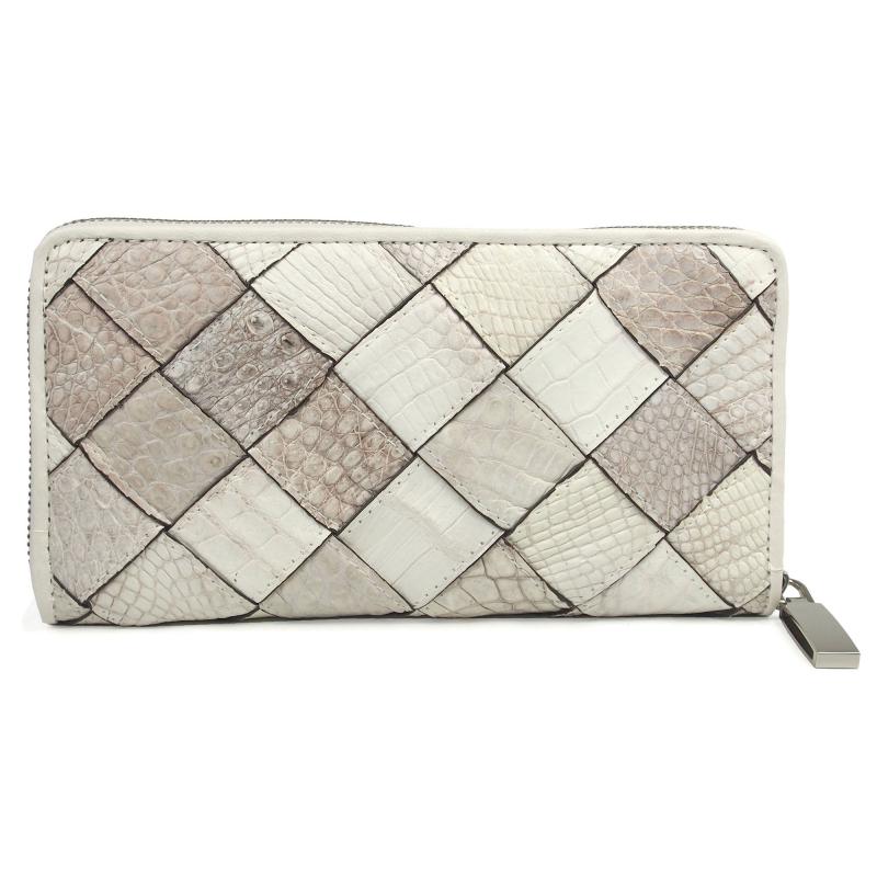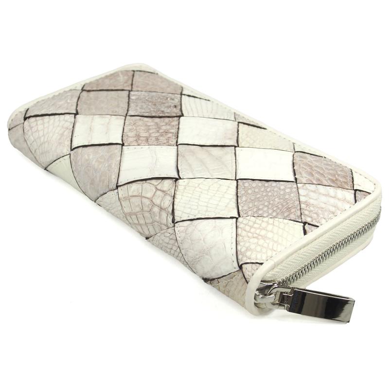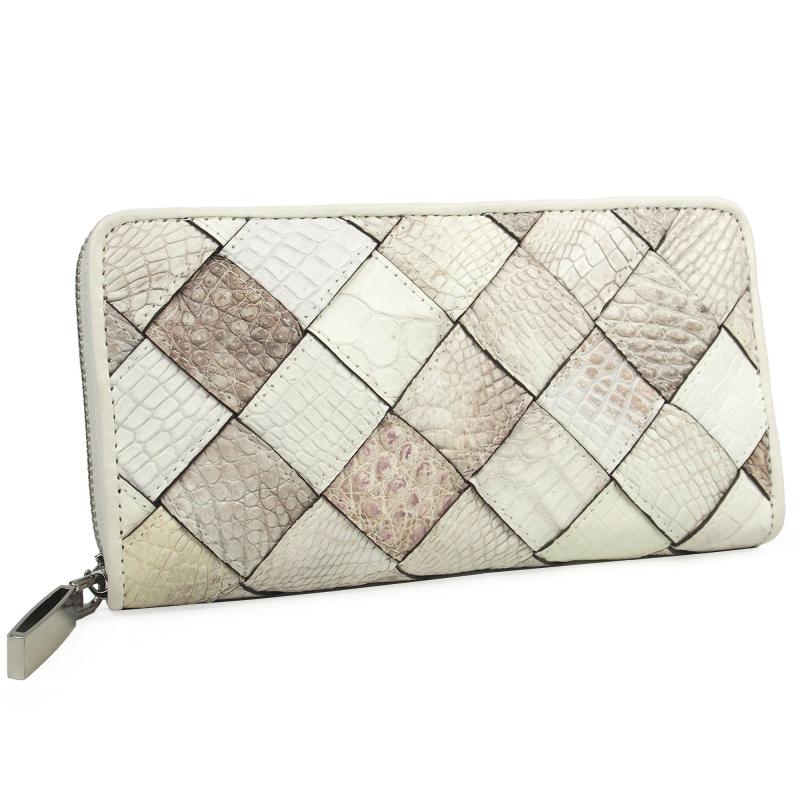 この財布は高級なクロコダイルの革を使用していて、革を大胆に太めに裁断し、丁寧に編み込んで仕立てたメッシュデザインの長財布です。