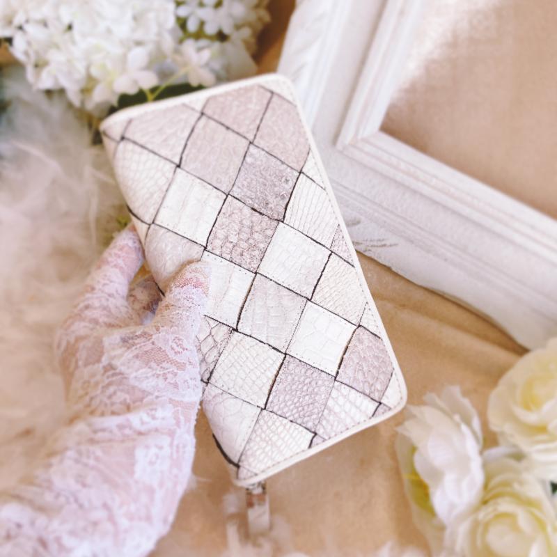 財布の中でも大容量のサイズ感が素晴らしく充実したタイプを、デザインクロコダイルで造りました。収納部分は19箇所もあり、ラウンドファスナーを開ければすべてを一目で見渡せます。カードだけでなく、お札も4種類を分けて収納できるため、レジでもたつくこともありません。