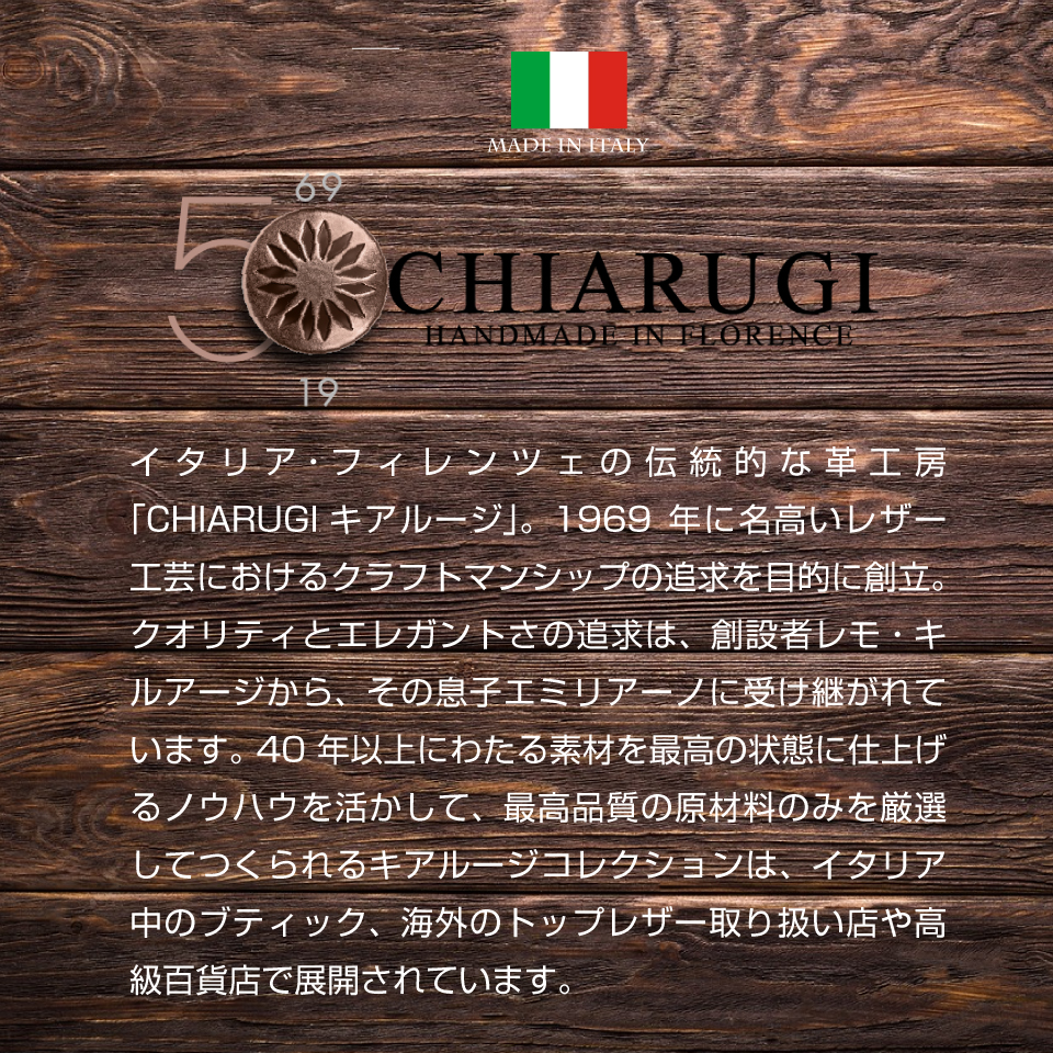 イタリア・フィレンツェの伝統的な革工房「CHIARUGI キアルージ」。1969年に名高いレザー工芸におけるクラフトマンシップの追求を目的に創立。クオリティとエレガントさの追求は、創設者レモ・キルアージから、その息子エミリアーノに受け継がれています。 40 年以上にわたる素材を最高の状態に仕上げるノウハウを活かして、最高品質の原材料のみを厳選してつくられるキアルージコレクションは、イタリア中のブティック、海外のトップレザー取り扱い店や高級百貨店で展開されています。
