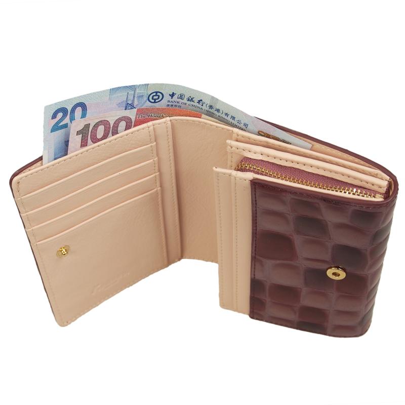 カードの収納部分は縦にも入れられるのでよく使うカードは見やすく取り出しやすくなっています。折り財布ながらカードポケットは18ヶ所も装備されています。カードをたくさん持ちたい主婦やOLさんにぴったりの豊富な収納機能です。また、お財布にボリュームが出たときもスナップボタンで留めて頂くことで安心して収納出来ます。