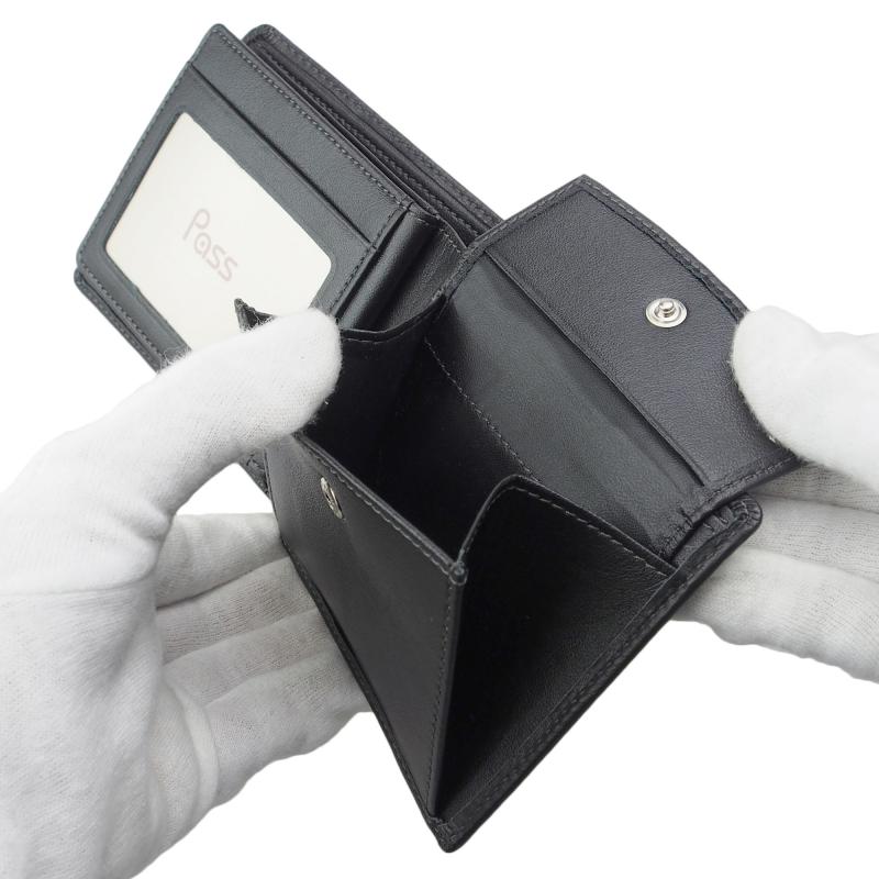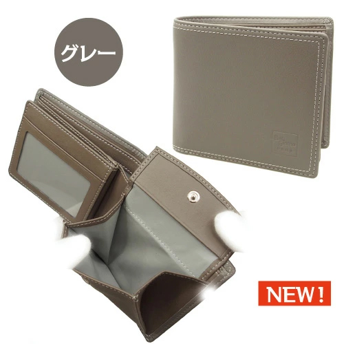 中ベラをボタンで留められる珍しいデザインの牛革二つ折り財布です。定期券や家族写真、ペットの写真を入れるのに最適なクリアポケット付き!