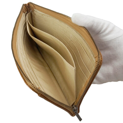 小銭入れ内部中心には小銭入れがあります。フタがないので中がよく見え、小銭を取り出しやすくできています。ファスナーを閉じるとお財布を逆さにしても、小銭が飛び出すことはありません。
