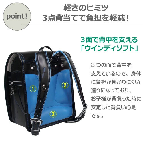 機能 | ・丈夫: 【強度をさらに向上】パワフルガード(大マチ補強)、大マチ芯材 ・背負い易い: ウイング背カン(エコボーン付き) ウインディソフト(3点背当て) ・反射: 反射材、反射印刷で360度反射 ・抗菌加工: 背・連尺裏に抗菌加工のロベニカ®使用 |