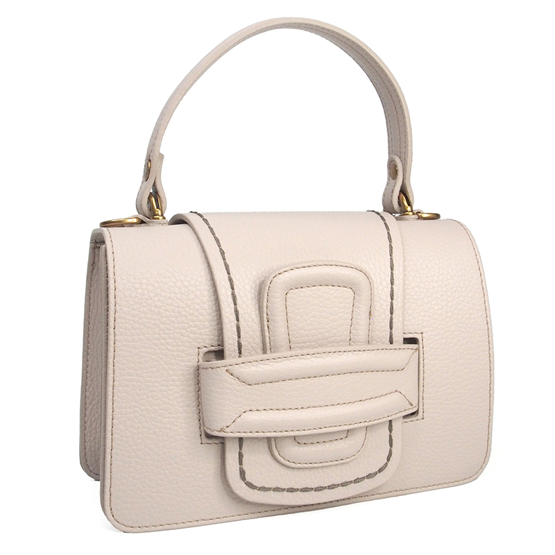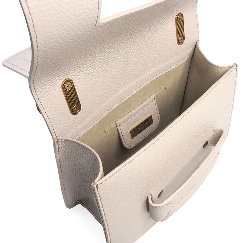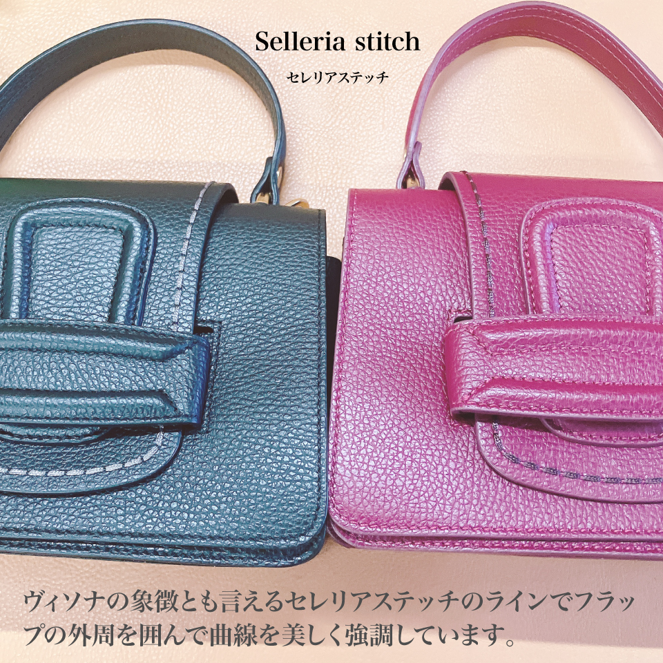 LINDAでは、フラップ部分が単なる“蓋”ではなく、バッグ本体と一体化するような立体裁断になっています。フラップの厚みと本体の張り感がバランスよく保たれているため、形崩れしにくい構造です。また、ヴィソナの象徴とも言えるセレリアステッチのラインでフラップの外周を囲んで曲線を美しく強調しているのがイタリア職人のハンドクラフトの温かみを感じさせます。