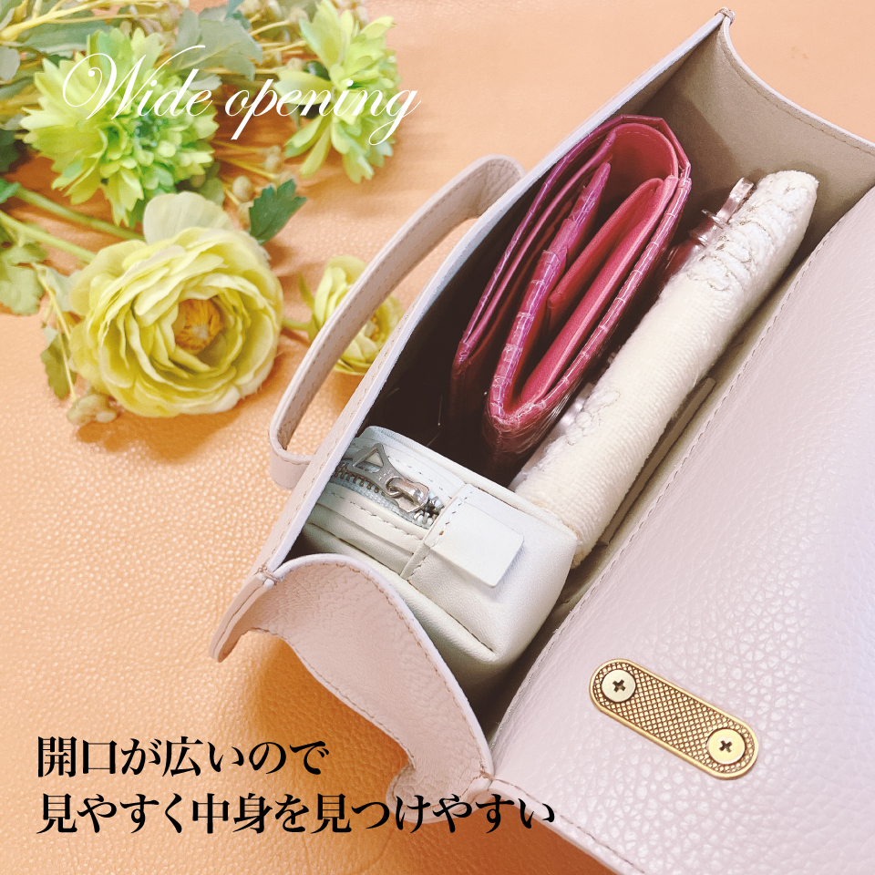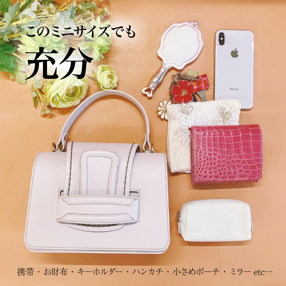 スカートスタイルにもパンツスタイルにも合わせ易いミニサイズです。コンパクトなので、日本人のように小柄な女性にもぴったりです。開口が広いので見やすく中身を見つけやすいです。携帯、お財布、キーホルダー、ハンカチ、小さめポーチ、ミラーなど収納できます。