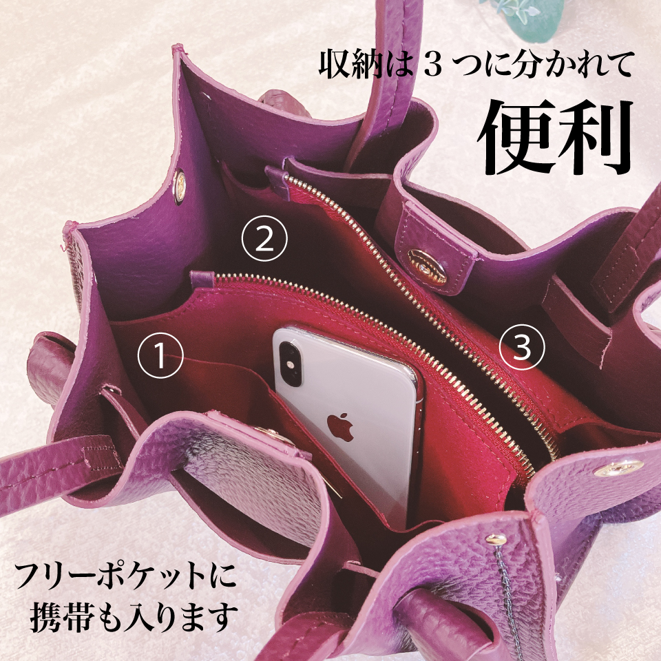 トップはマグネットで留めるタイプで、両サイドにあおりポケットがあり便利です。更にフリーポケットもついているので小物の整理がしやすいです。そしてセンター部分はジッパー開閉で防犯面も安心です。ジッパーを開くと開口が広くて見やすく、中身がすぐに確認できます。たっぷりとマチをとっていて、サイドの下の方のカッティングは女性らしい丸み帯びたカットでおしゃれです。携帯、お財布、キーホルダー、ハンカチ、ポーチ、パスケース、ミラー、手帳、折り畳み傘、グラスケース、ペンケースなどたくさんのものを収納できます。