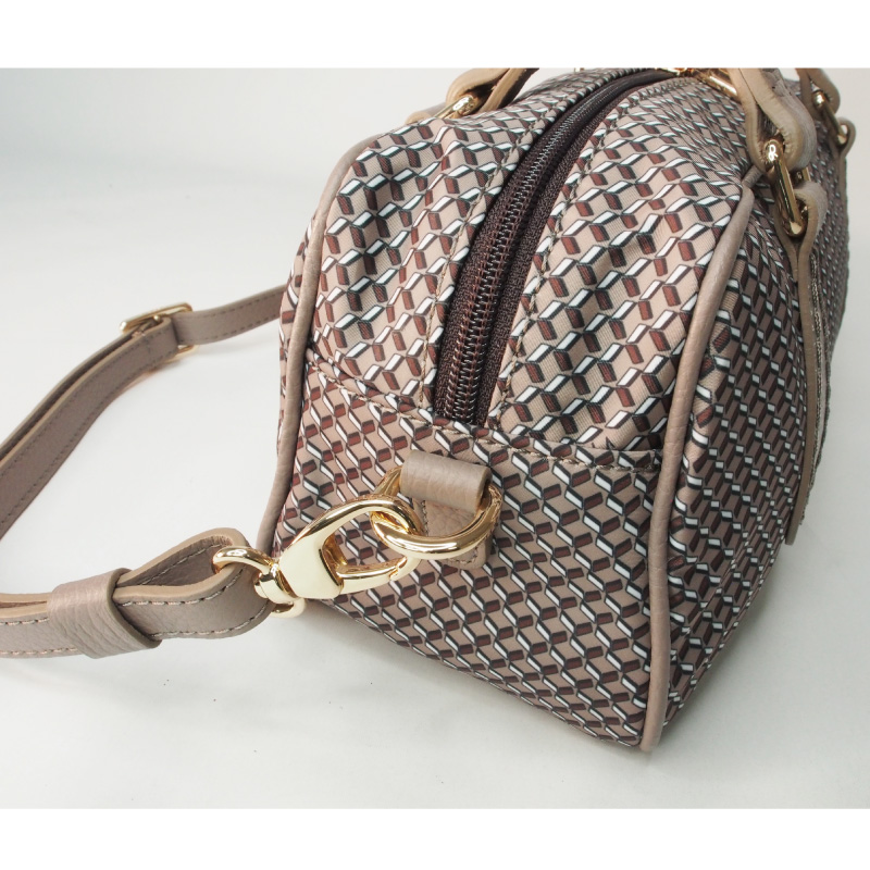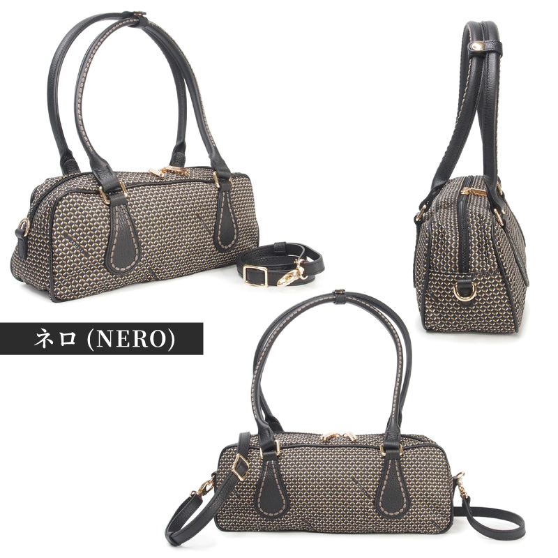立体的な幾何学模様の高級ナイロン素材としっとりと手に馴染むカーフレザーを組み合わせた、100%イタリア製バッグです。エレガントな雰囲気でかつ軽くて丈夫な機能性、実用性を兼ね備えています。