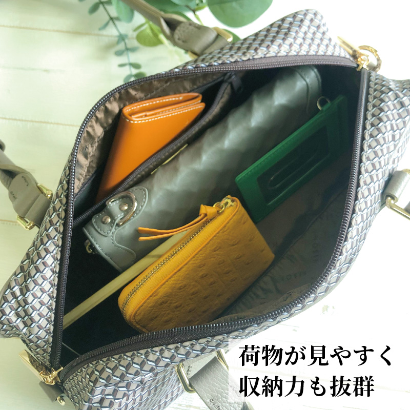 最大の魅力はゆったり長めに設計されたロングハンドルです。コートやジャケットを着ていてもスムーズに肩に掛けられ荷物が多くてもストレスなくお使い頂けます。