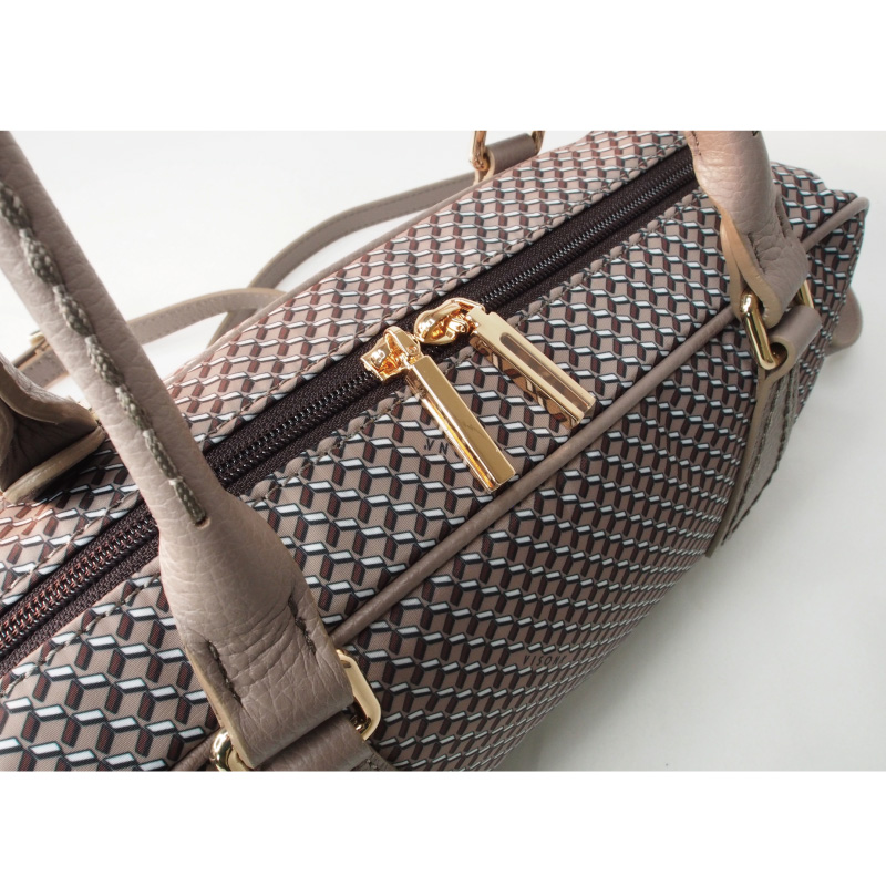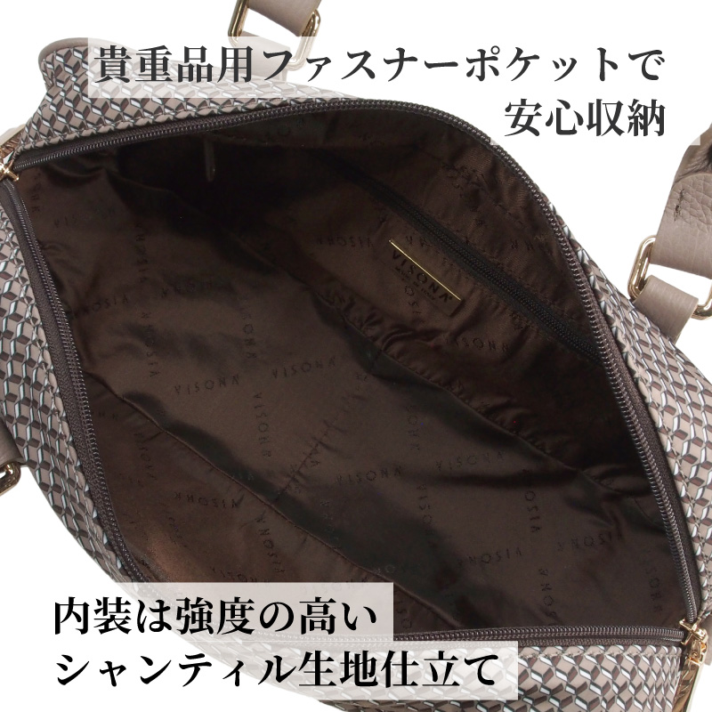 バッグ全面にプリントされたヴィソナのアイコンである「ヴィソナステッチ」を、美しい立体感のある幾何学模様で表現したパターン柄が印象的です。上品な光沢がエレガントさと高級感を醸し出しています。 触り心地も滑らかで程よいハリ感があり、撥水・軽量・耐久など機能面でも優れている高機能ナイロンファブリックを採用しています。